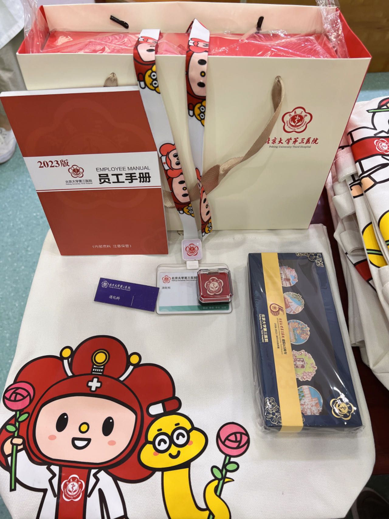 礼包内,有熠熠生辉的三院院徽;有独具匠心的“三院四季”文创徽章,寓意着新职工将在三院这片沃土上茁壮成长;有充满创意的文创胸卡带,巧妙融合了医院特色与时尚元素,彰显青春活力;有精致的纪念杯套装,饱含着长辈们对新职工“多喝热水”的关怀,员工手册等必备文件则被细心安置于文创帆布包内。大礼包里的每一件礼品都经过精心挑选与设计,让新职工在打开礼包的那一刻,就能深刻感受到来自三院大家庭的温暖与期望。
