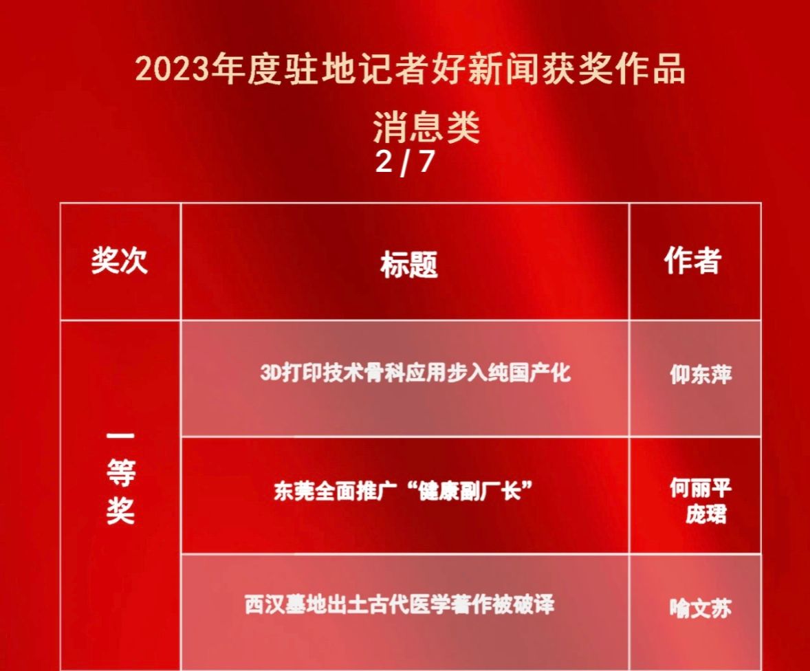 2024年8月21日,健康报社对2023年全国驻地记者好新闻评选结果进行了公布。获奖作品分为消息、通讯和图片三类。其中消息类和通讯类一等奖各3个,二等奖各8个,图片类一等奖1个,二等奖2个。我院宣传中心主任仰东萍新闻作品《3D 打印技术骨科应用步入纯国产化》荣获消息类作品“一等奖”。此次获奖充分肯定了该作品在健康报医疗卫生报道中的价值和影响力。