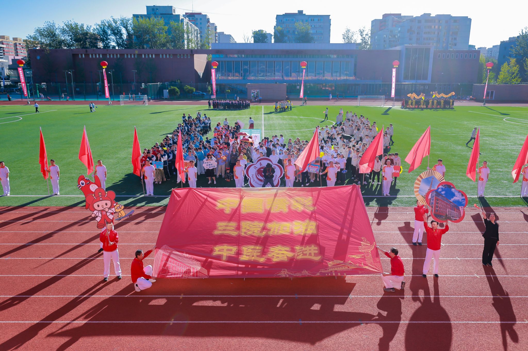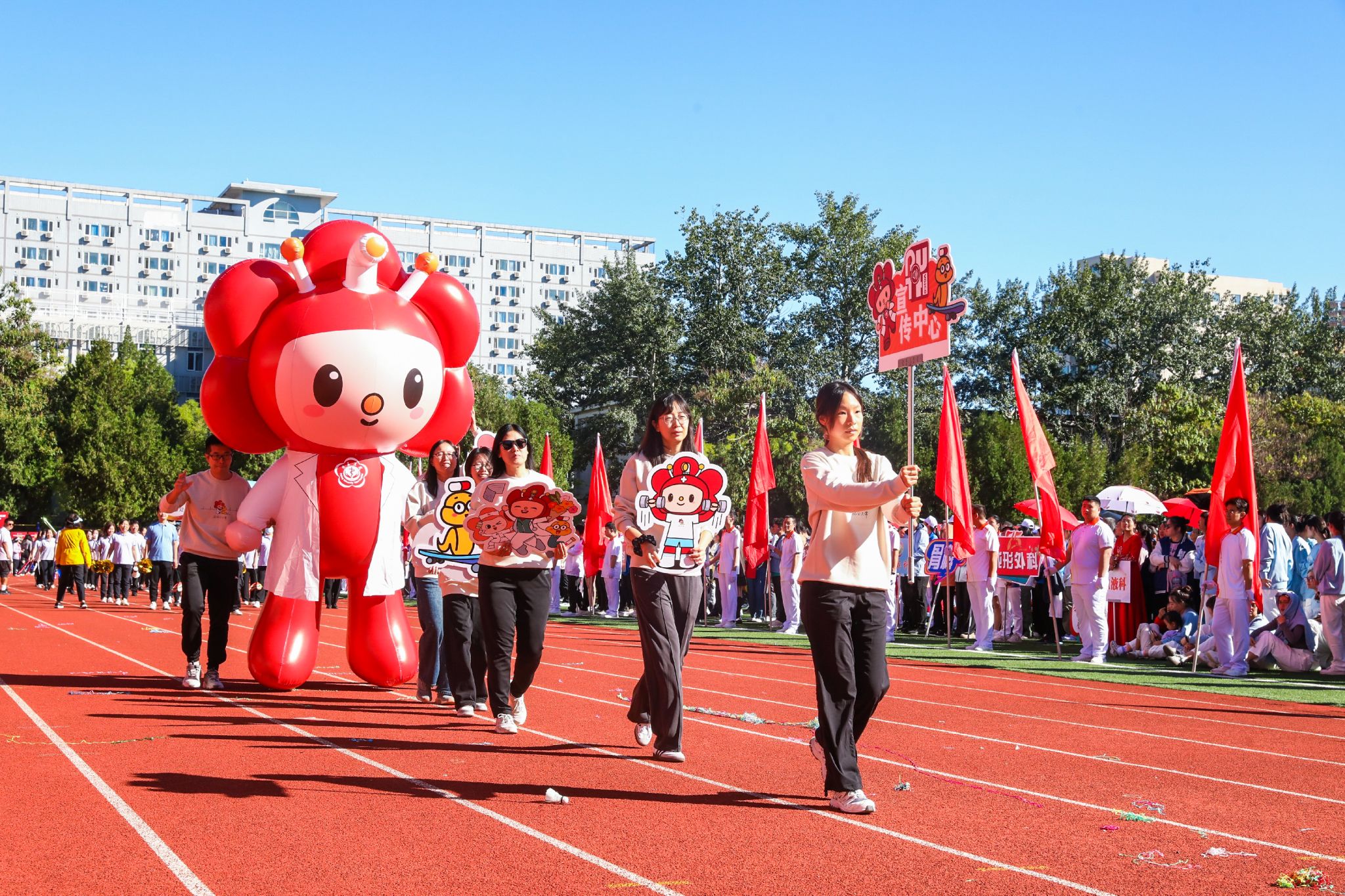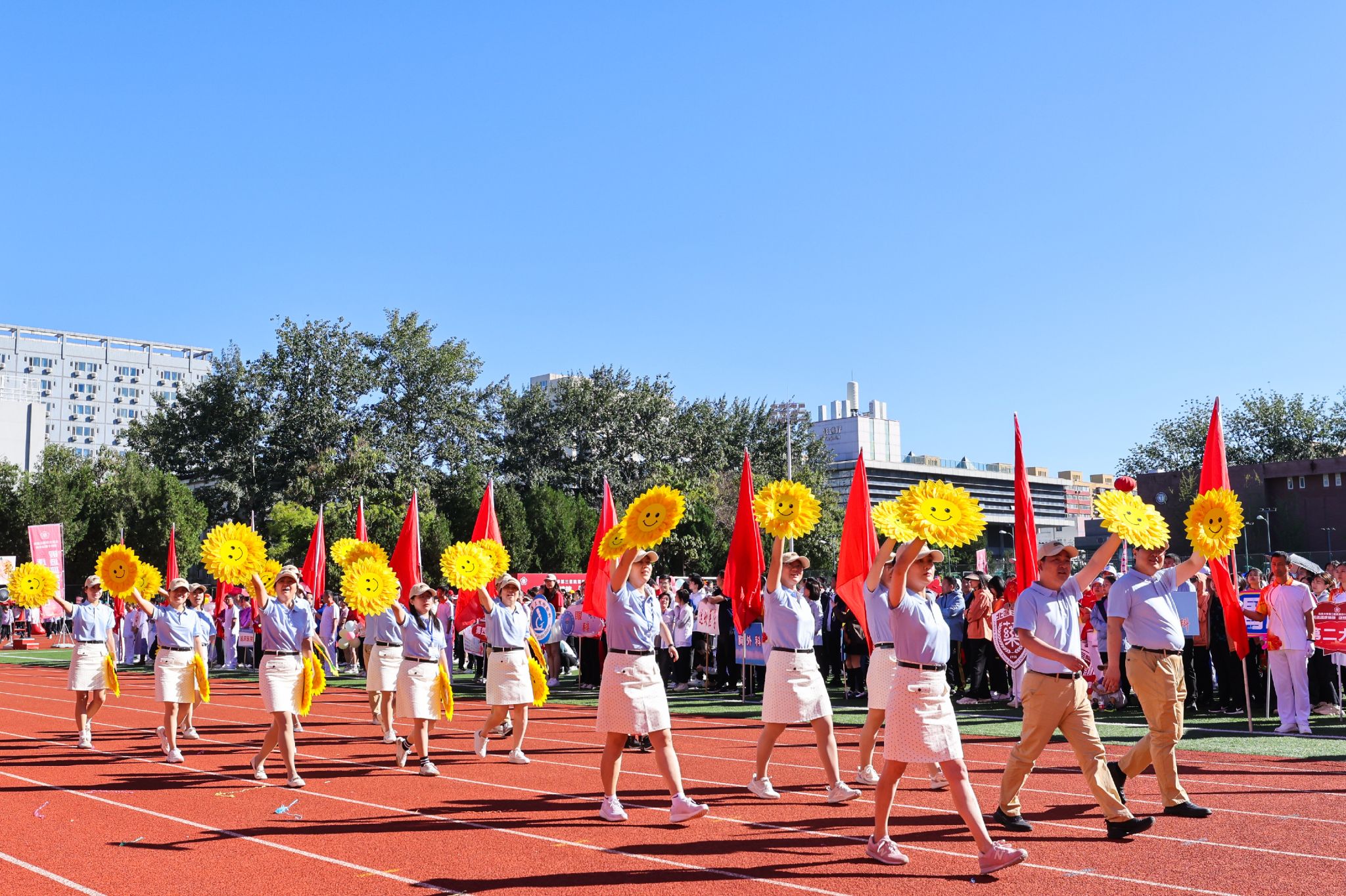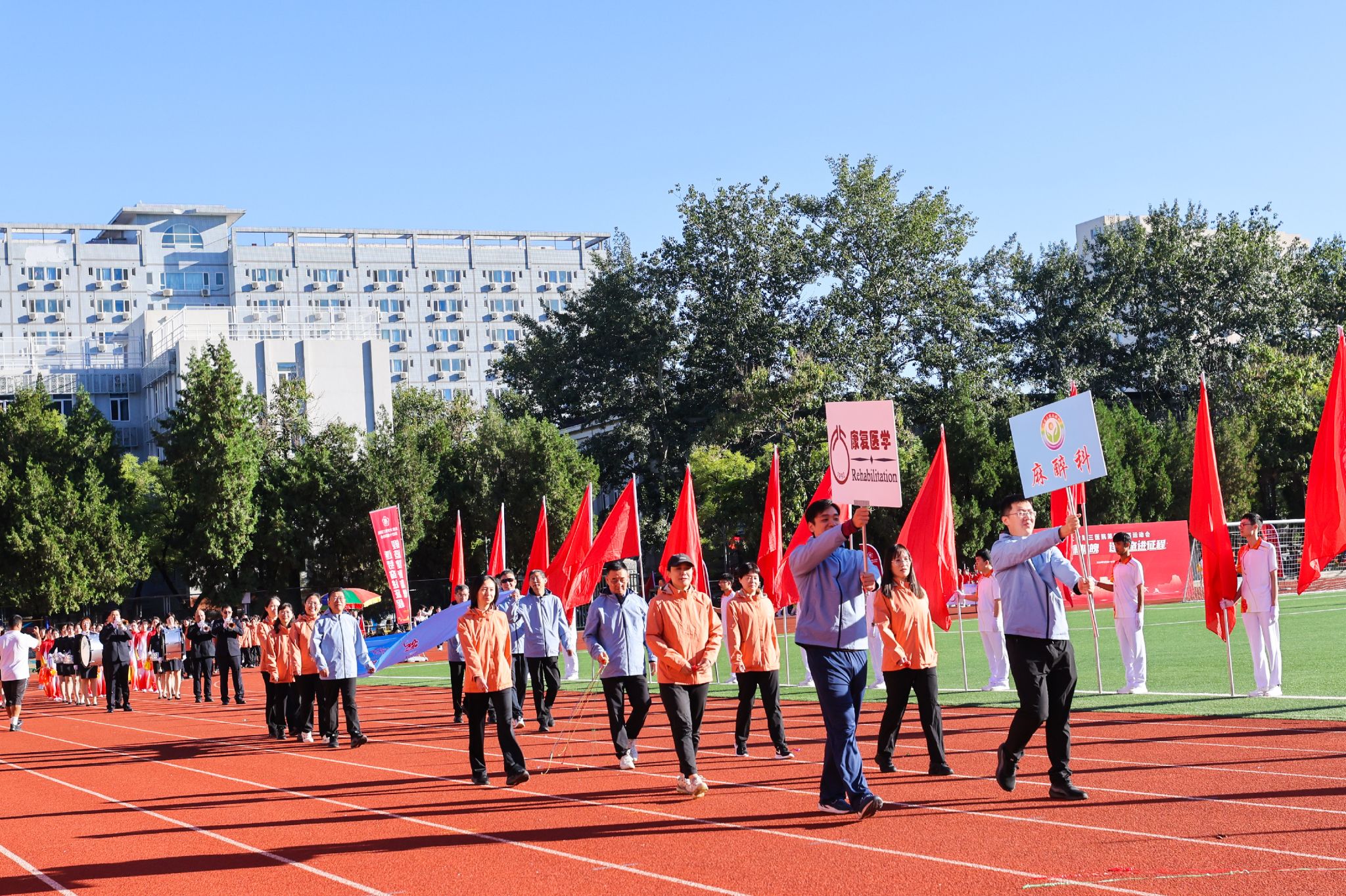 在激昂的《运动员进行曲》声中,现场气氛瞬间被点燃。国旗队、院徽队、红旗队身姿挺拔,目光坚定,步伐整齐,口号响亮,飞扬的旗帜在风中猎猎作响。入场式表演各出新意、各展风采,职工们精神抖擞,奋发昂扬,充分展示北医三院“团结、奉献、求实、创新”的精神文化。今年是中华人民共和国成立75周年,各科室在入场式表演中纷纷融入庆祝元素,在展示科室和院区文化内涵的同时,表达着对祖国深深的热爱之情。