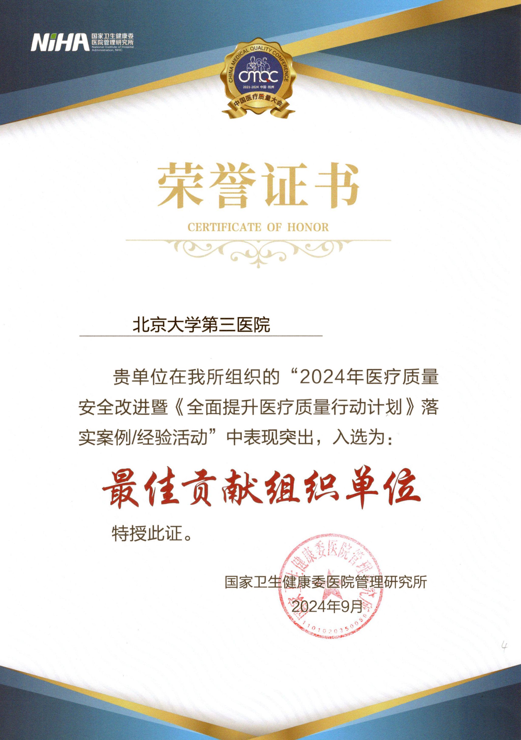在“2024年医疗质量安全改进暨《全面提升医疗质量行动计划》落实案例/经验征集活动”中,我院9项案例入选“卓越案例”,其中6项经复赛现场答辩获评为全国“百佳案例”。同时,医院荣获最佳贡献组织奖。