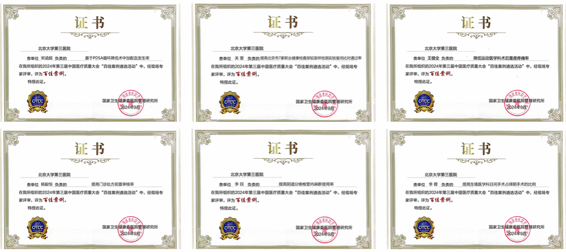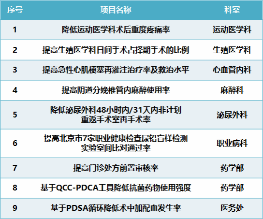 运动医学科项目“降低运动医学科术后重度疼痛率”、生殖医学科项目“提高生殖医学科日间手术占择期手术的比例”、心血管内科项目“提高急性心肌梗塞再灌注治疗率及救治水平”、麻醉科项目“提高阴道分娩椎管内麻醉使用率”、泌尿外科项目“降低泌尿外科48小时内/31天内非计划重返手术室再手术率”、职业病科项目“提高北京市7家职业健康检查尿铅盲样检测实验室间比对通过率”、药学部项目“提高门诊处方前置审核率”和“基于QCC-PDCA工具降低抗菌药物使用强度”、医务处项目“基于PDSA循环降低术中加配血发生率”入选“卓越案例”。