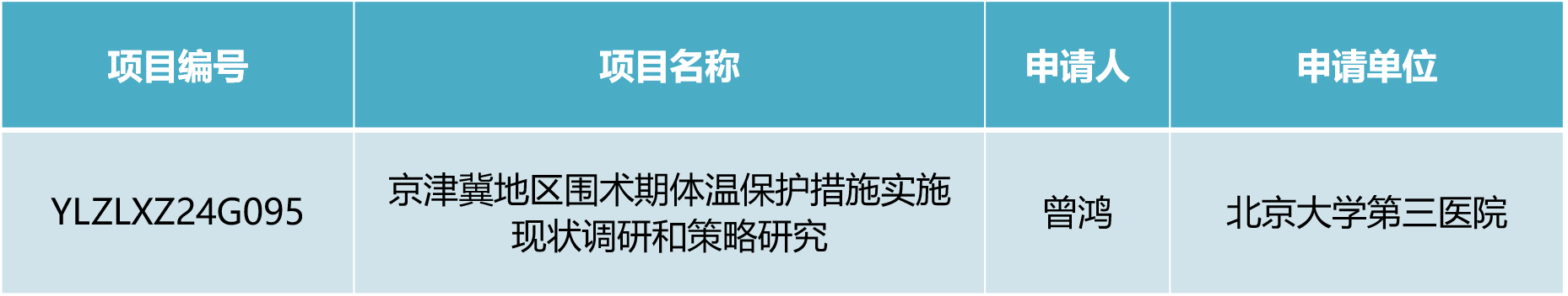 此外,在“2024年医疗质量(循证)管理研究项目征集活动”中,我院麻醉科项目“京津冀地区围术期体温保护措施实施现状调研和策略研究”获批立项。北医三院麻醉科是北京市及海淀区临床麻醉质量控制和改进中心,在首都麻醉质控体系建设、数据上报系统研发与应用、麻醉质控指标的确立等方面进行一系列开创性工作,为北京市临床麻醉的均质化发展做出了积极贡献。未来,麻醉科将依托北京市质控中心平台以及研究项目,总结、探索质量管理的新模式,为国家整体医疗质量管理体系建设和麻醉专科领域医疗质量持续提升贡献力量。