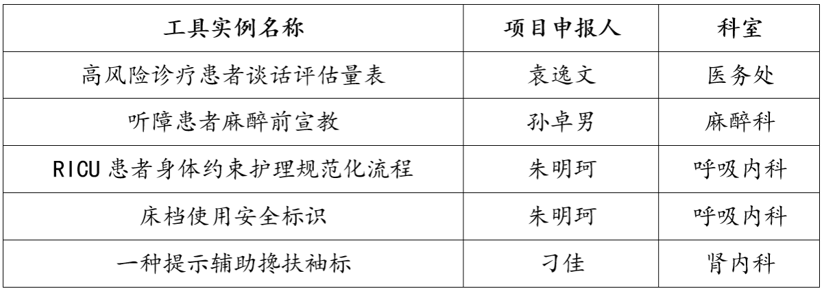 在大会首次举办的“患者安全工具典型实例”评选活动中,我院医务处项目“高风险诊疗患者谈话评估量表”、麻醉科项目“听障患者麻醉前宣教”、呼吸与危重症医学科项目“RICU患者身体约束护理规范化流程”和“床档使用安全标识”,以及肾内科项目“一种提示辅助搀扶袖标”获评 “患者安全工具典型实例”,并进行壁报展示和现场案例交流。