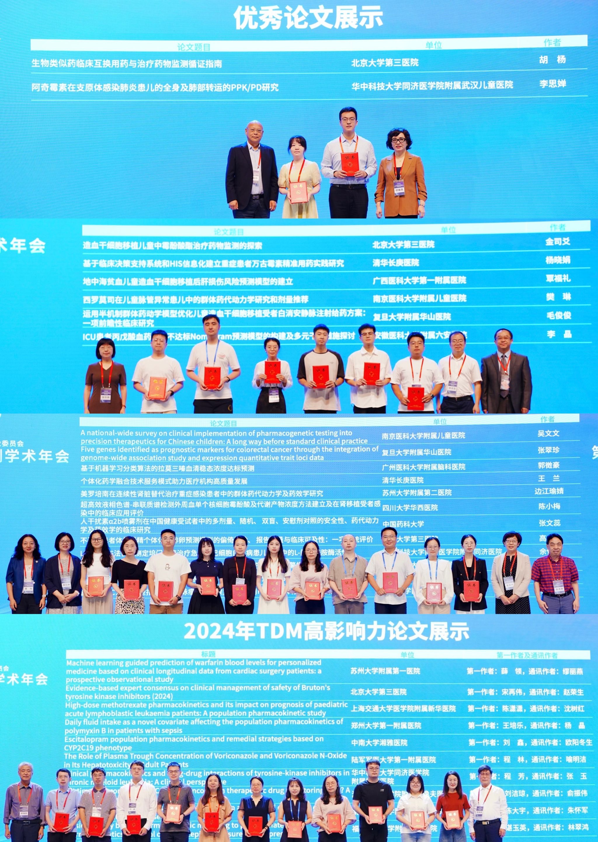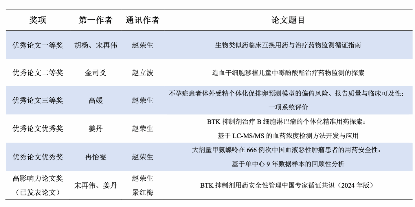 在本届会议的高质量学术论文征文评选中,经评审专家两轮匿名评审,药学部博士研究生胡杨、主管药师宋再伟的论文“生物类似药临床互换用药与治疗药物监测循证指南”荣获优秀论文一等奖,并受邀在“优秀TDM论文报告”分会场进行学术交流;金司爻药师、研究生姜丹、高媛、冉怡雯的论文也分别获评优秀论文二等奖和优秀奖,充分展现了药学部团队在TDM及临床药学领域的学术创新力和行业影响力。在年度高影响力论文评选中,宋再伟、姜丹作为共同第一作者发表的“BTK抑制剂用药安全性管理中国专家循证共识(2024年版)”荣获“高影响力论文奖”,并受邀在“优秀TDM论文报告”分会场进行学术交流。