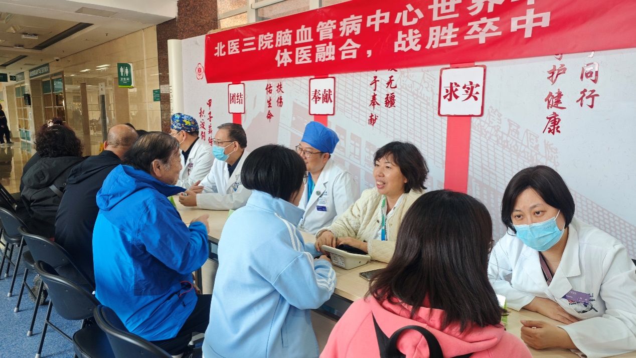 2024年10月29日是第19个世界卒中日。今年世界卒中日的宣传主题为“体医融合,战胜卒中”,即倡导通过科学运动预防卒中发生,促进患者康复,提高生活质量。29日当天,脑血管疾病诊治中心在医院门诊楼二层举办义诊活动。此次活动旨在提高公众对卒中(即中风)的认知,推广“体医融合”的理念,帮助大家有效预防和应对卒中风险。