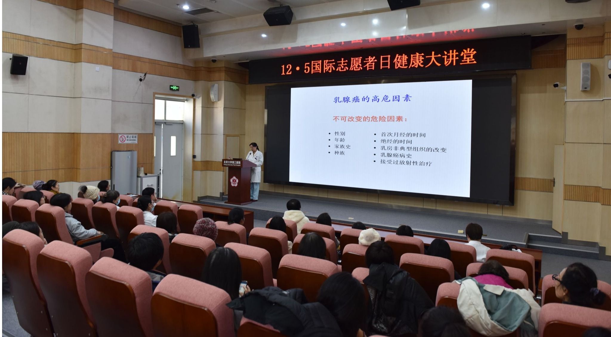 随后,普通外科乳腺专业组主任医师赵红梅为志愿者们带来了以“呵护生命,关爱乳腺健康”为主题的精彩讲座。讲座内容涵盖了乳腺疾病的预防、诊断、治疗以及日常护理等多个方面,并强调了早期发现和早期治疗的重要性,为大家带来了科学实用的健康保健知识。