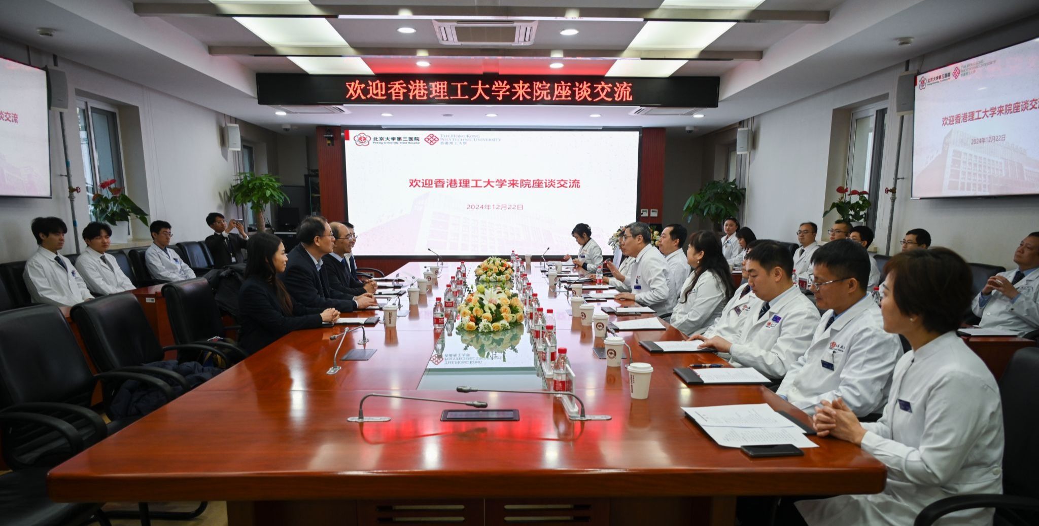 2024年12月22日,香港理工大学常务副校长黄永德教授、工程学院院长文効忠教授和生物医学工程系主任张明教授等一行五人组成的代表团来访我院。此次访问旨在共同探讨双方在共建联合实验室、项目申请、人才培养、医工交叉融合创新等方面的合作,携手推进医学创新与学科发展。北医三院付卫院长代表医院对代表团一行表示欢迎并主持召开了座谈会,党院办、教育处、科研处、普通外科、中心实验室等相关负责人和专家代表参加座谈。