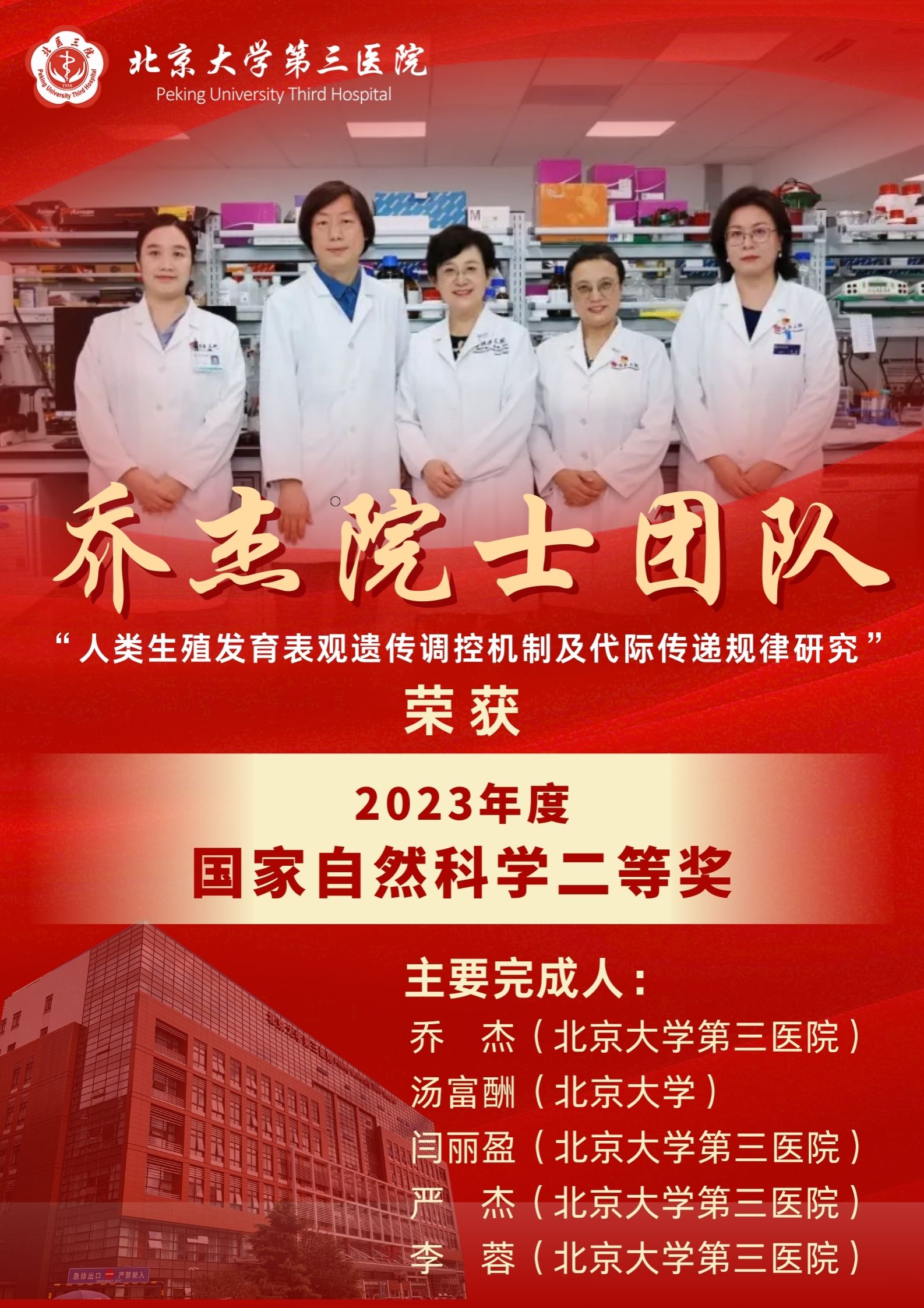生殖医学科团队荣获国家自然科学奖二等奖;运动医学科、泌尿外科团队等分别荣获北京市科学技术进步奖、北京医学科技奖、华夏医学科技奖;联合国教科文组织授予乔杰院士第8届“联合国教科文组织-赤道几内亚国际生命科学研究奖”。