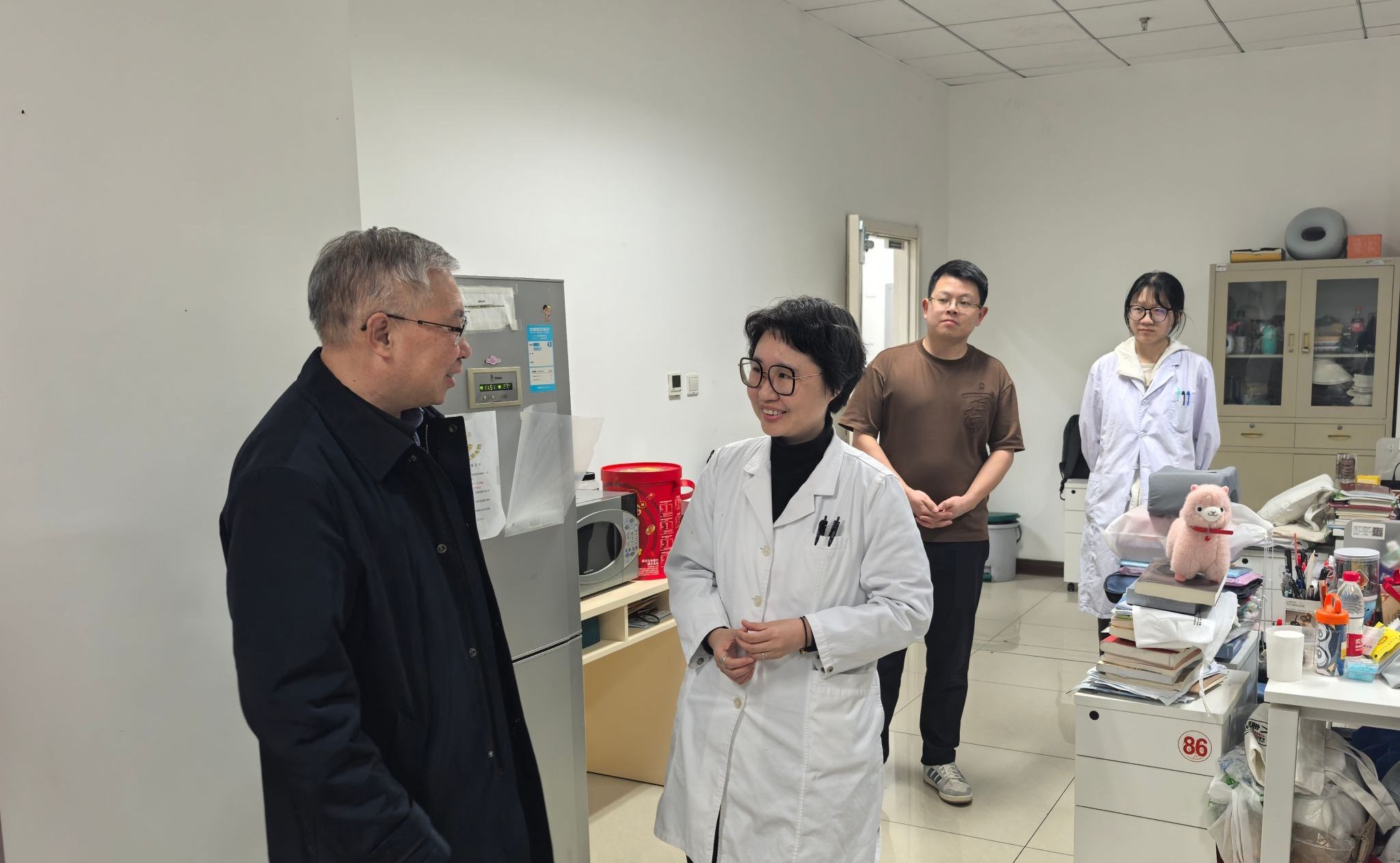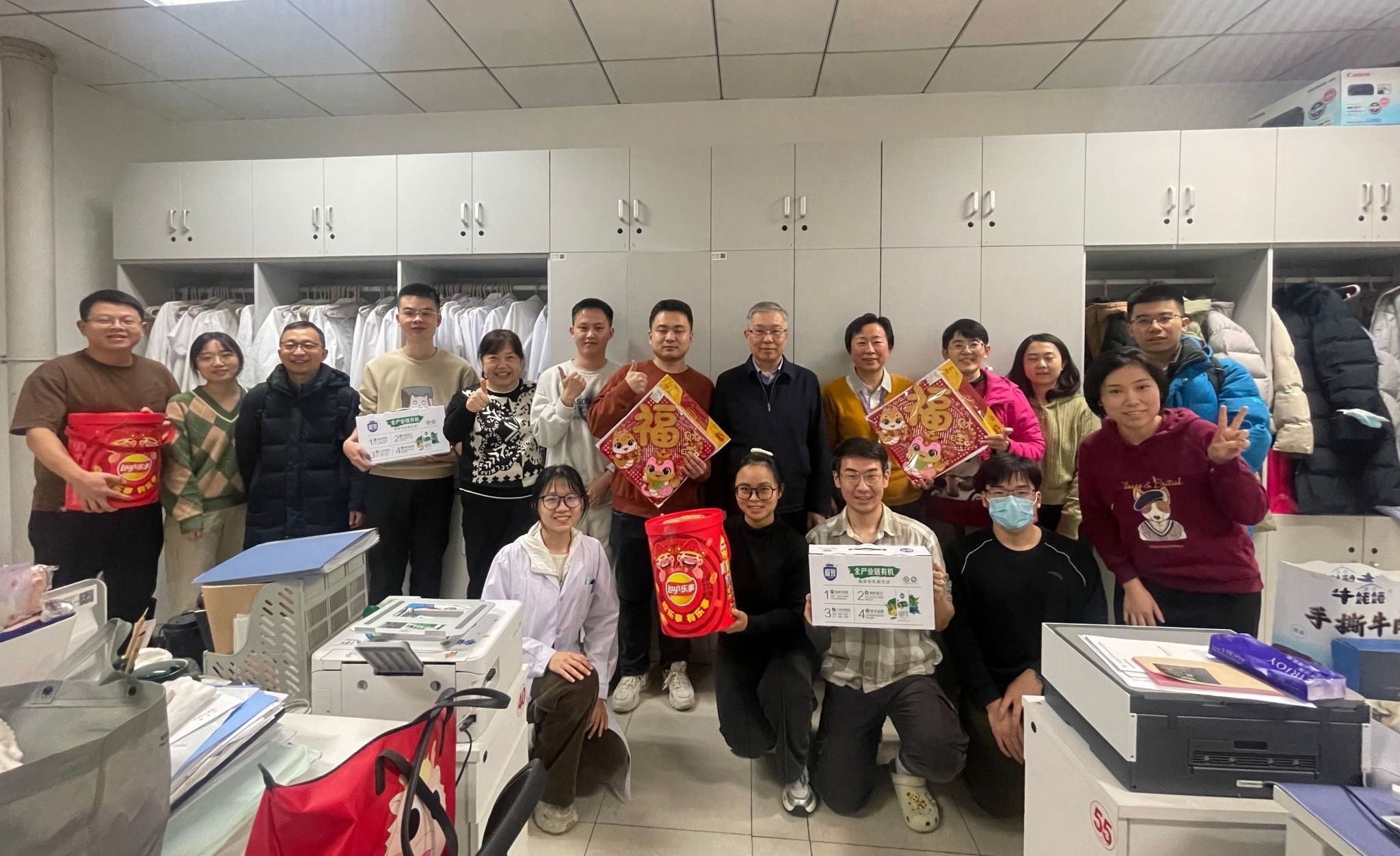 在天工大厦,金昌晓书记来到学术学位研究生的科研学习场所,向实验室同学和老师们深入了解日常学习工作情况。针对学生晚间的学习沙龙活动,金书记提出了更高期待,建议课题组定期组织科研进展汇报,增加同学们日常锻炼机会,以提升交流表达能力。最后,金书记向师生们表达新春祝福并与大家合影留念。