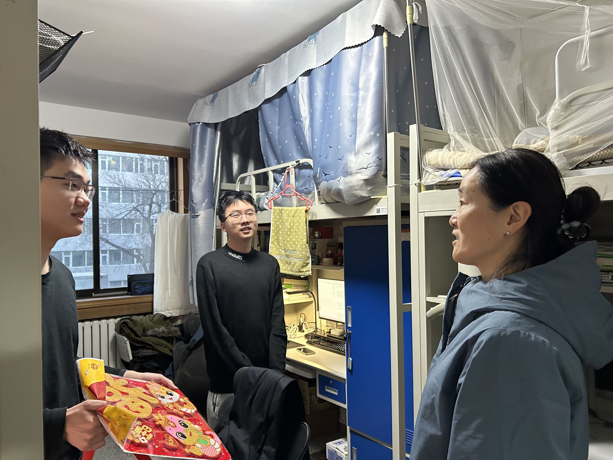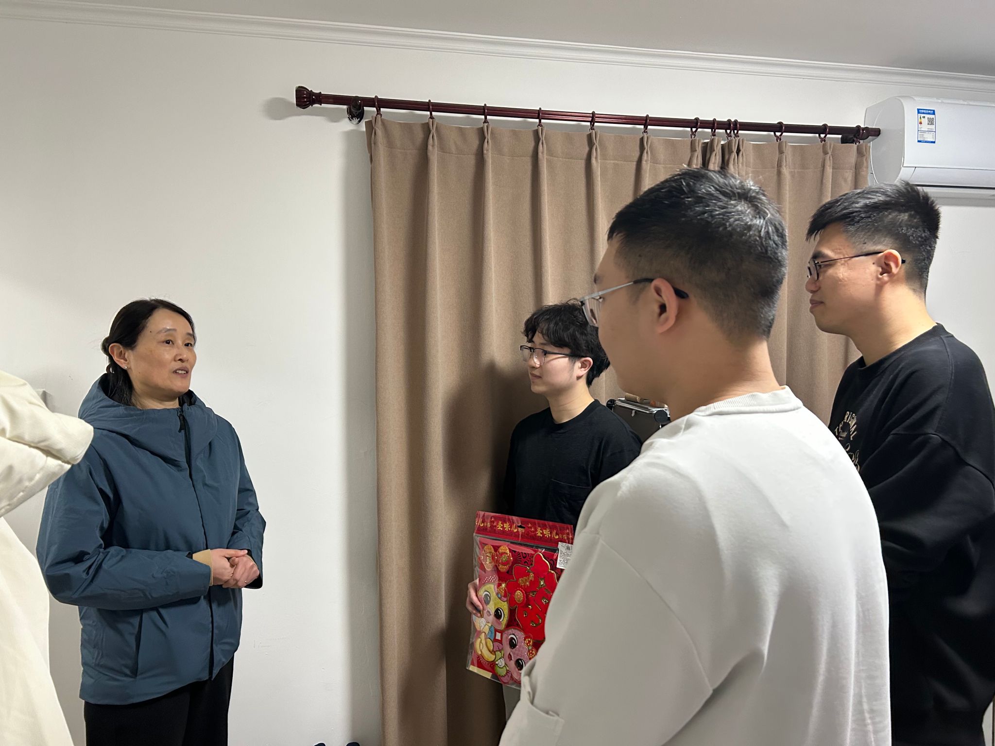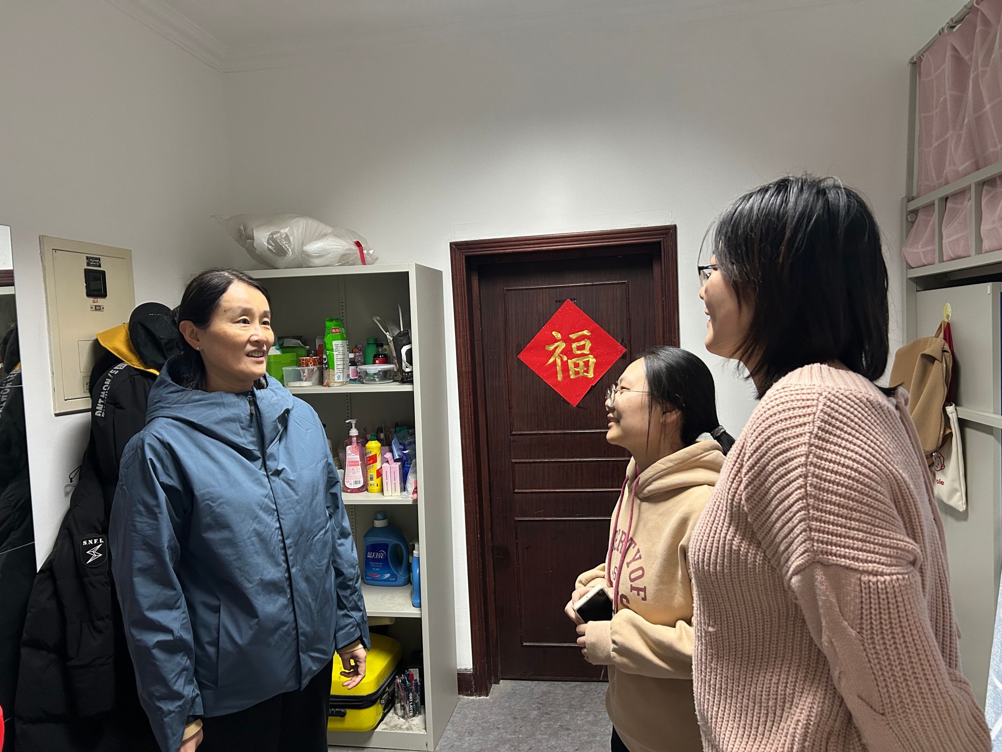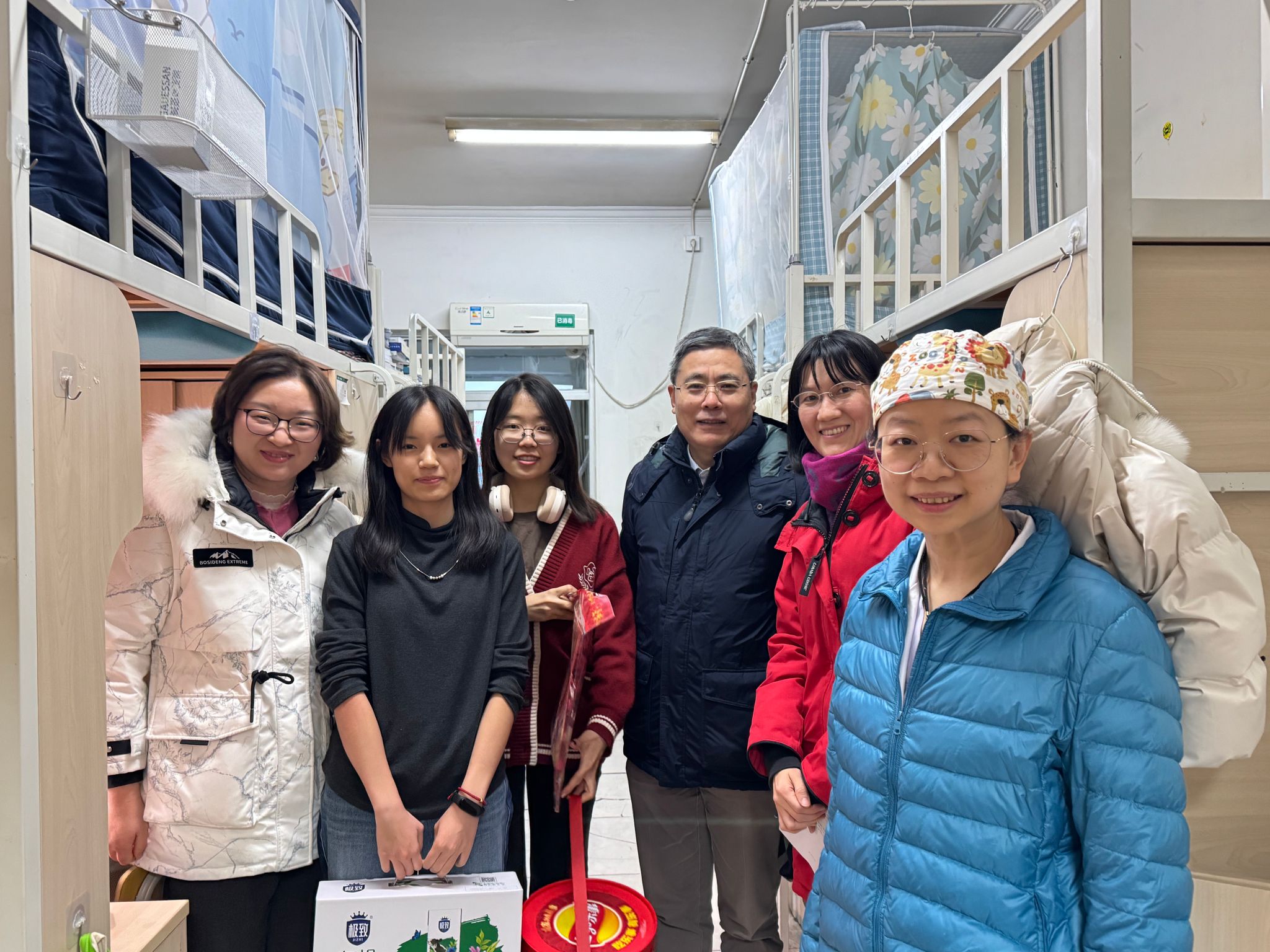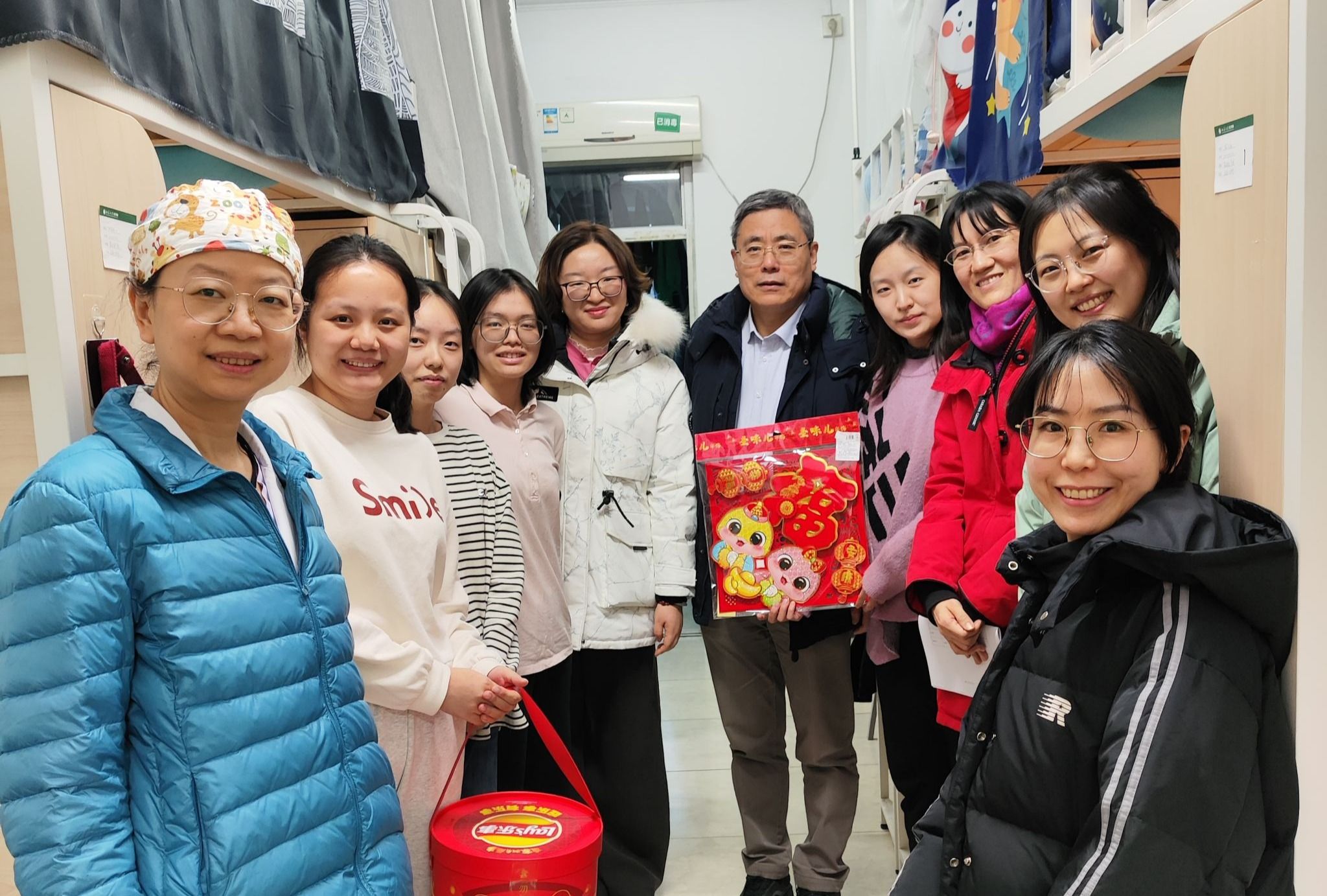 沈宁副院长分别到青年公寓和教育教学中心学生宿舍慰问。在青年公寓,她询问每个学生的春节假期安排,以及值班等情况,关切地说:“快过年了,大家尽量安排时间回家看看,和爸妈一起过个团圆年。”她还特别提醒学生们春节期间注意安全。