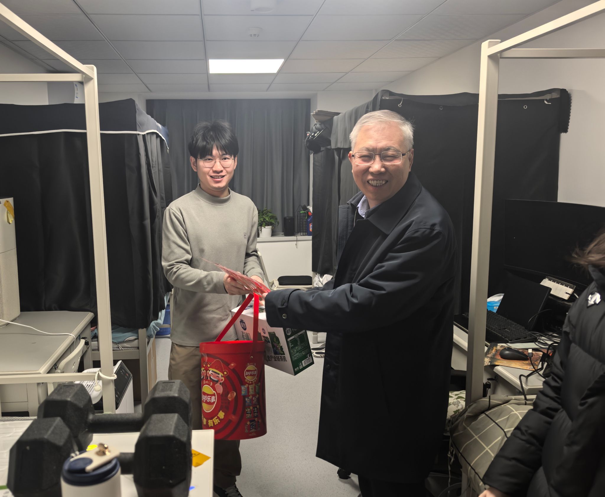 金昌晓书记先后来到志新公寓宿舍和天工大厦慰问。“网络怎么样?暖气热不热?”在志新公寓,金书记仔细查看新宿舍的整体环境后,就网络覆盖、供暖设施、通勤便利程度等问题与同学们亲切交谈。“新宿舍在校园和医院外,更加牵动着老师们的心。医院以最大的诚意安排大家的住宿条件,同学们关注的一切就是我们要关心考虑的。”金书记还嘱咐同学们要注意假期安全,并向同学们送上温暖的节日祝福。