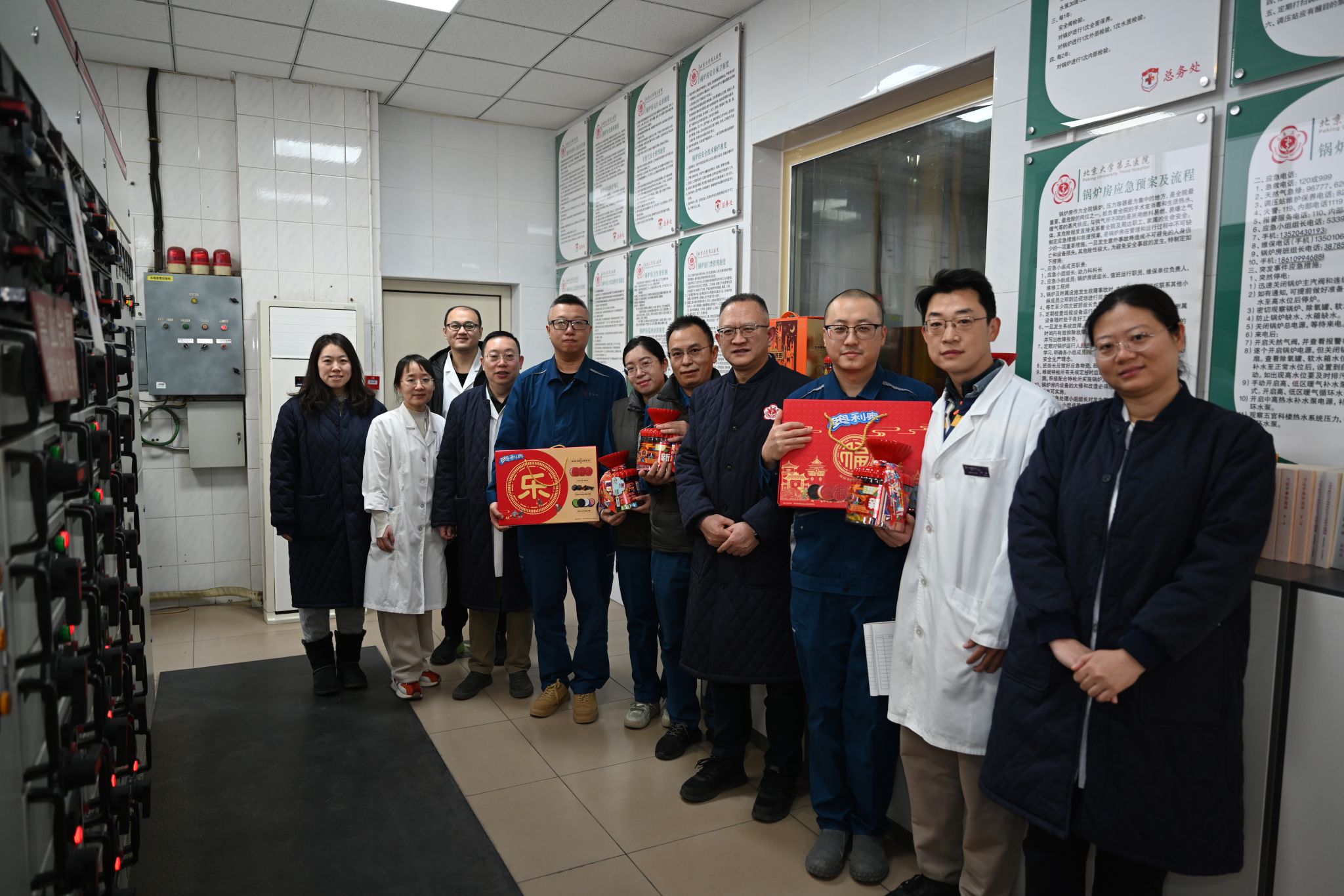“大家辛苦了!给大家拜年了!”副院长宋纯理一行先后来到了配电室、锅炉房、洗衣房,详细了解设备运行、维护情况,向保障医院后勤工作平稳运行的职工表示诚挚慰问。随后,副院长宋纯理一行来到营养食堂,为工作人员送上新春祝福,强调要重视食品安全,继续为患者做好服务。在中心供应室,副院长宋纯理查看了医疗器械的消毒、灭菌等工作流程,并向职工致以新春问候。在保卫处中控室,副院长宋纯理查看消防联动模拟演示操作系统,询问春节期间人员值班安排并向坚守岗位的工作人员送上节日祝福。