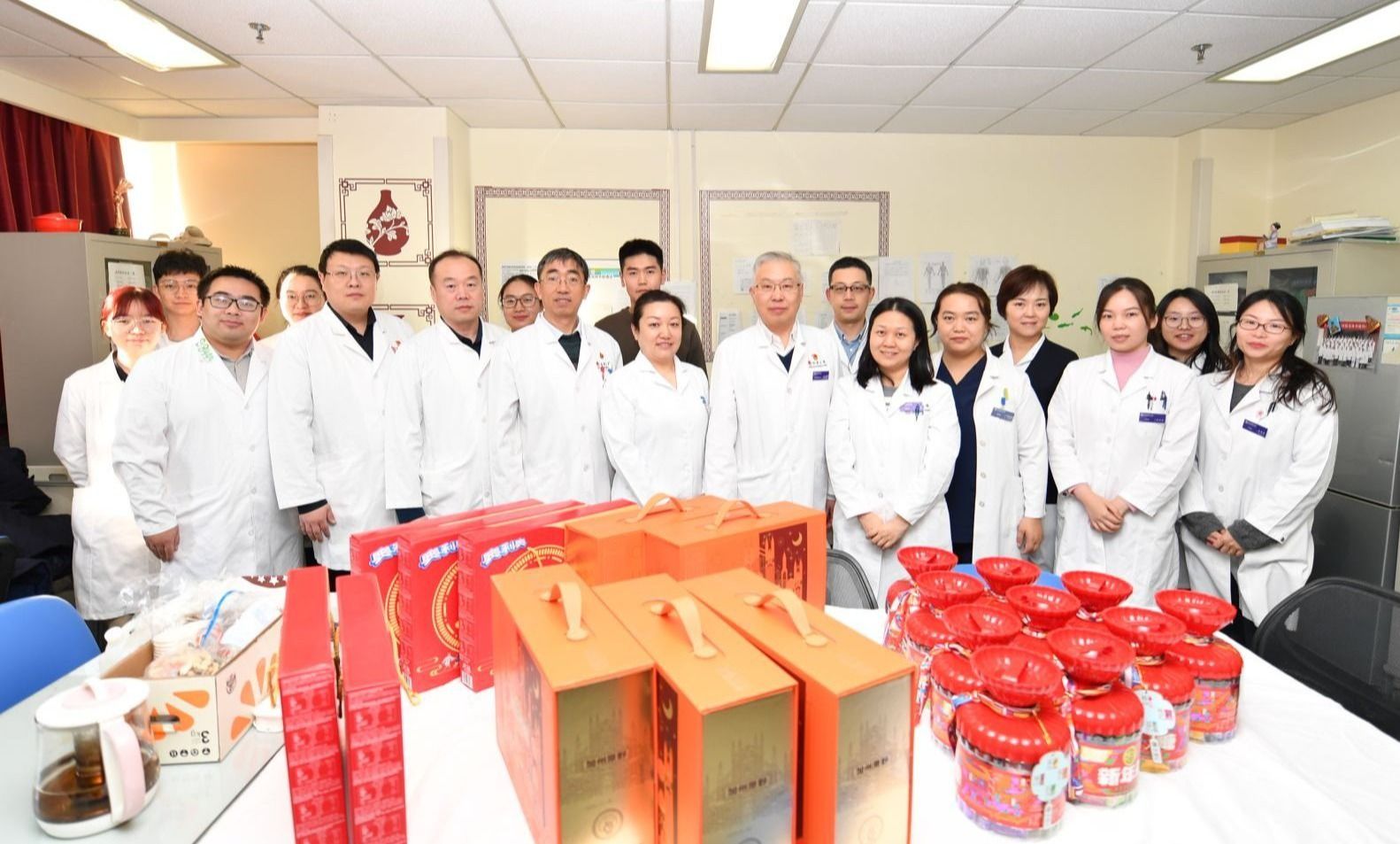 “新春佳节即将到来,给大家拜年了!”党委书记金昌晓一行首先来到皮肤科病房,了解病房情况,并为大家送上春节祝福。他还亲切地询问医学生学习、生活情况,言语间充满关怀。