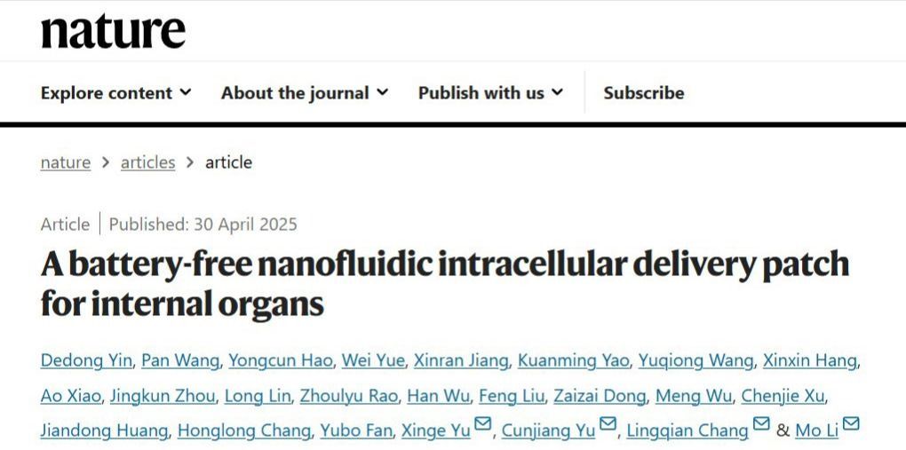 2025年4月30日,北医三院李默教授团队与北京航空航天大学常凌乾教授团队、美国伊利诺伊大学香槟分校余存江教授团队及香港城市大学于欣格教授团队合作在Nature期刊在线发表了题为“A battery-free nanofluidic intracellular delivery patch for internal organs” (一种用于内脏器官的无电池纳米流体细胞内递送贴片)的论文,通过“医-工-化”大交叉模式实现重大疾病关键因子筛选,提出靶向治疗新策略。