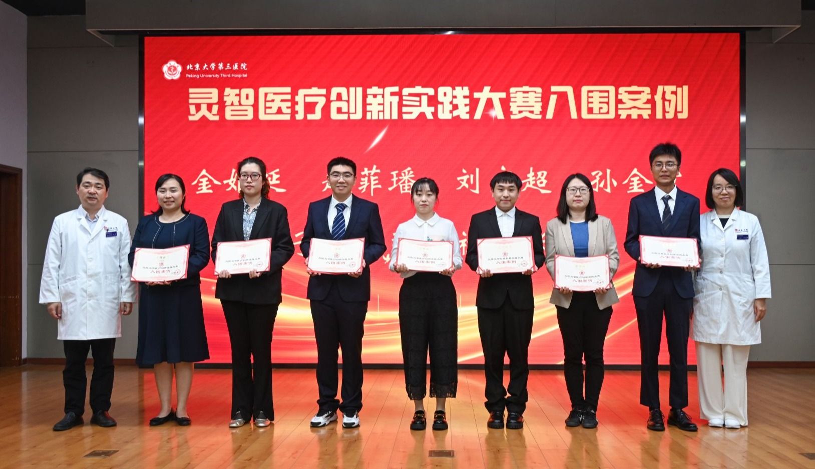 经评审专家综合评定,骨科周非非、信息管理与大数据中心朱声荣、急诊科付源伟、骨科李卓夫、麻醉科刘畅、普通外科原春辉、心血管内科李丹、门诊部王苏蒙、超声医学科薛恒和呼吸与危重症医学科刘贝贝荣获“北医三院灵智医疗创新实践大赛DS+临床应用优秀案例”奖。护理部金姬延、呼吸与危重症医学科赵菲璠、检验科刘宏超、体检中心孙金霞、危重医学科赵子豪、肿瘤放疗科张坤禄和风湿免疫科张晓盈荣获“北医三院灵智医疗创新实践大赛DS+临床应用入围案例”奖。院领导为获奖代表颁发奖杯和荣誉证书。