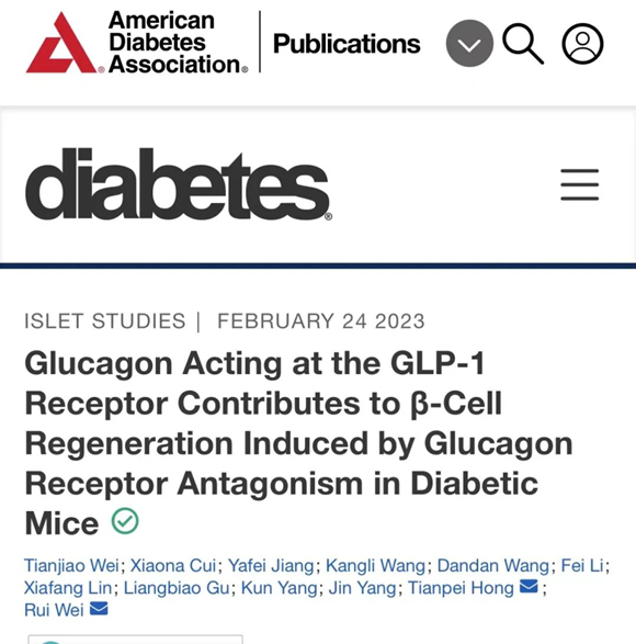 2023年2月25日,北京大学第三医院内分泌科魏蕊研究员/洪天配教授研究团队,在内分泌代谢专业顶级期刊、美国糖尿病学会官方期刊《糖尿病》(Diabetes)在线发表题目为“胰高糖素作用于GLP-1受体参与调控胰高糖素受体阻滞诱导的糖尿病小鼠β细胞再生”(Glucagon Acting at the GLP-1 Receptor Contributes to β-Cell Regeneration Induced by Glucagon Receptor Antagonism in Diabetic Mice)的研究成果。
