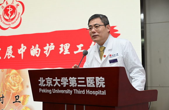 付卫副院长代表我院党政领导向护理团队表达敬意。他在讲话中强调,三院的蒸蒸日上离不开全院护理人员的努力。2022年,我院圆满完成冬奥会医疗保障,不负国家重托、医者使命;全力救治新冠重症患者,获得百姓满意,政府认可。三年抗疫路,布满护理人的足迹,无论是拉萨还是崇礼,无论是隔离酒店还是方舱医院,哪里需要,我们的护士就在哪里。付卫副院长对护理工作取得的诸多成绩表示祝贺,并对建设我院高质量的护理队伍提出三点要求,一是优化护理流程,贴心护理有温度;二是结合AI技术,智慧护理有高度;三是善用科研思维,专业护理有深度。他希望“团结、高效、协同、智慧”的三院护理人像玫瑰一样绽放!