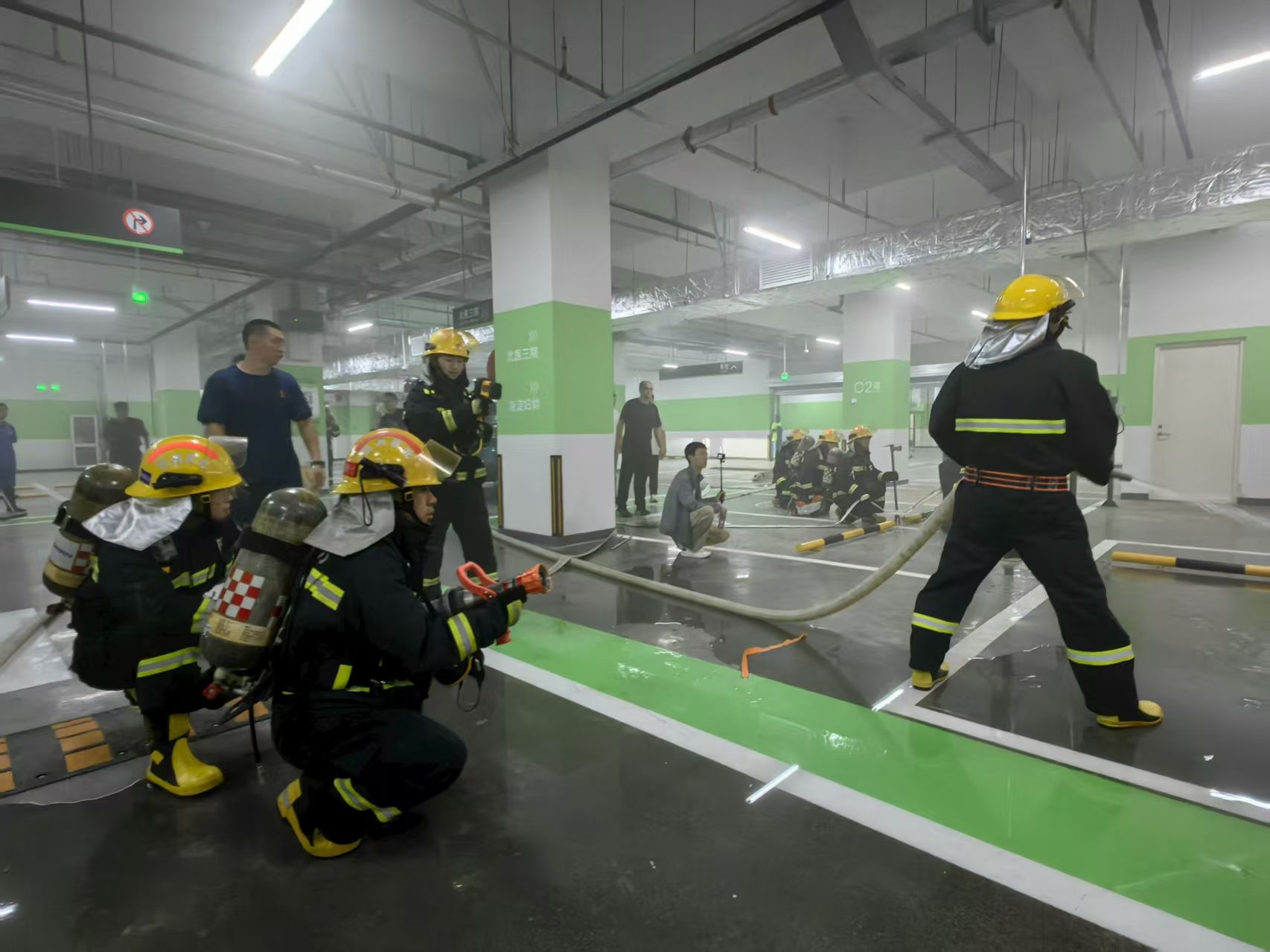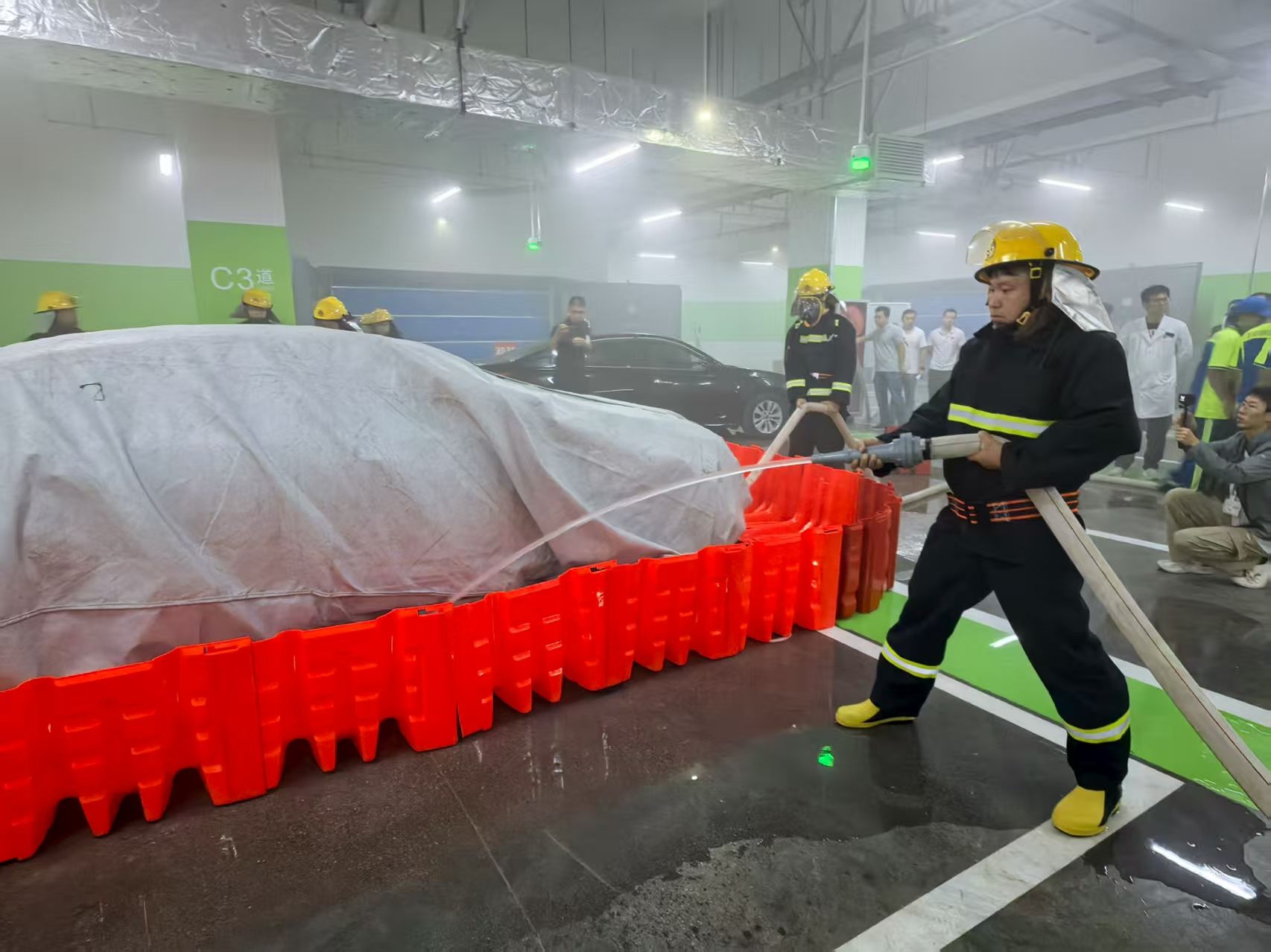 演练模拟了地下停车场内新能源汽车突发火灾的紧急场景。警报响起后,中控室值机员迅速响应启动防火卷帘控制防火分区,启动风机进行排烟,微型消防站人员迅速奔赴现场架设水枪阵地,使用汽车灭火毯、拖车器、车底出水灭火装置、挡水围堰进行现场处置,专业消防人员到场后同步开展扑救,有序展开灭火。整个过程各单位紧密配合、动作熟练,演练取得圆满成功。