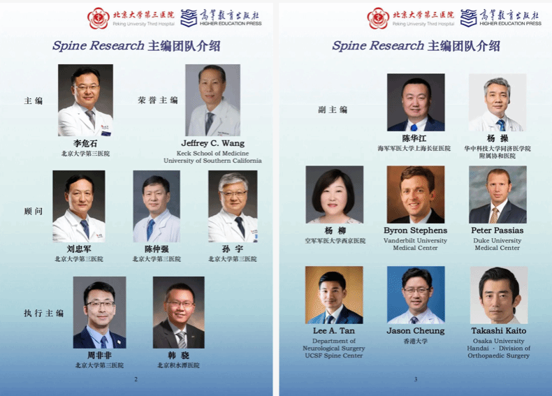 期刊特邀国际脊柱领域权威专家、原北美脊柱学会NASS主席、南加州大学Keck医学院的Jeffrey C. Wang担任荣誉主编,聘请北医三院陈仲强教授、刘忠军教授、孙宇教授担任顾问,编委会汇聚了韩骁教授、陈华江教授、杨操教授、杨柳教授等多区域的国内外知名脊柱外科中心学科带头人,还邀请了范德堡大学医学中心的Byron Stephens,杜克大学医学中心的Peter Passias,UCSF脊柱中心的Lee A. Tan,香港大学的Jason Cheung,大阪大学的Takashi Kaito等来自美、日、韩等多国的全球知名专家在编委会中担任重要职务。