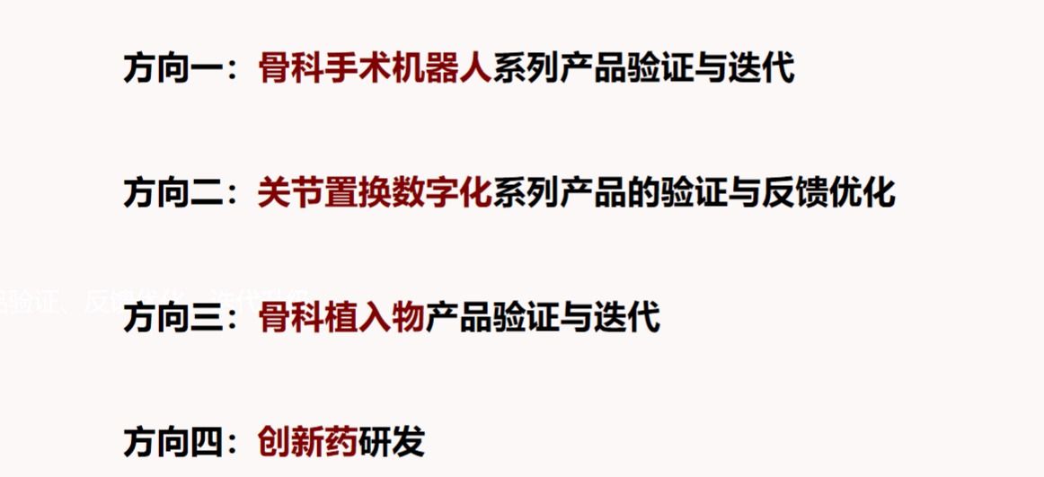 骨科专业围绕骨科手术机器人、关节置换数字化产品、骨科植入物进行验证、迭代及反馈优化,并开展创新药物研发。