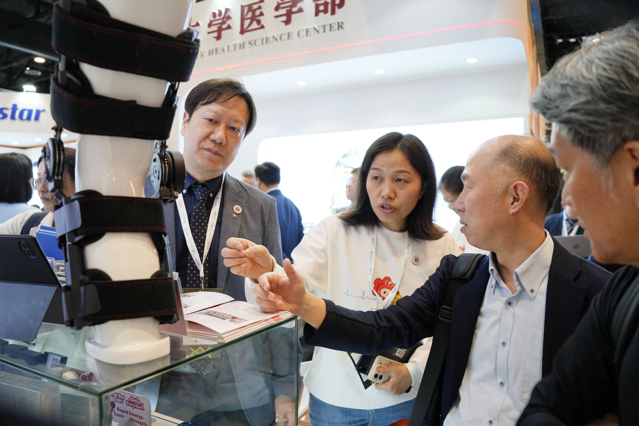 展会期间,英国医疗局副主任David Sheppard率英国公立医院代表团专程参访北大医学展台。英格兰皇家外科学院事业发展与国际合作部主任Anya Yerokhina、伦敦大学学院全球健康商学院事业拓展总监David Huff在展台与北医三院专家团队会谈,围绕个性化定制人工关节、智能支具、新一代生物活性脊柱内植物、组织工程软骨支架模型的技术细节与临床应用数据,以及3D打印髋臼杯、可降解镁合金植入物等精准治疗与未来材料方向,展开全方位深入交流。
