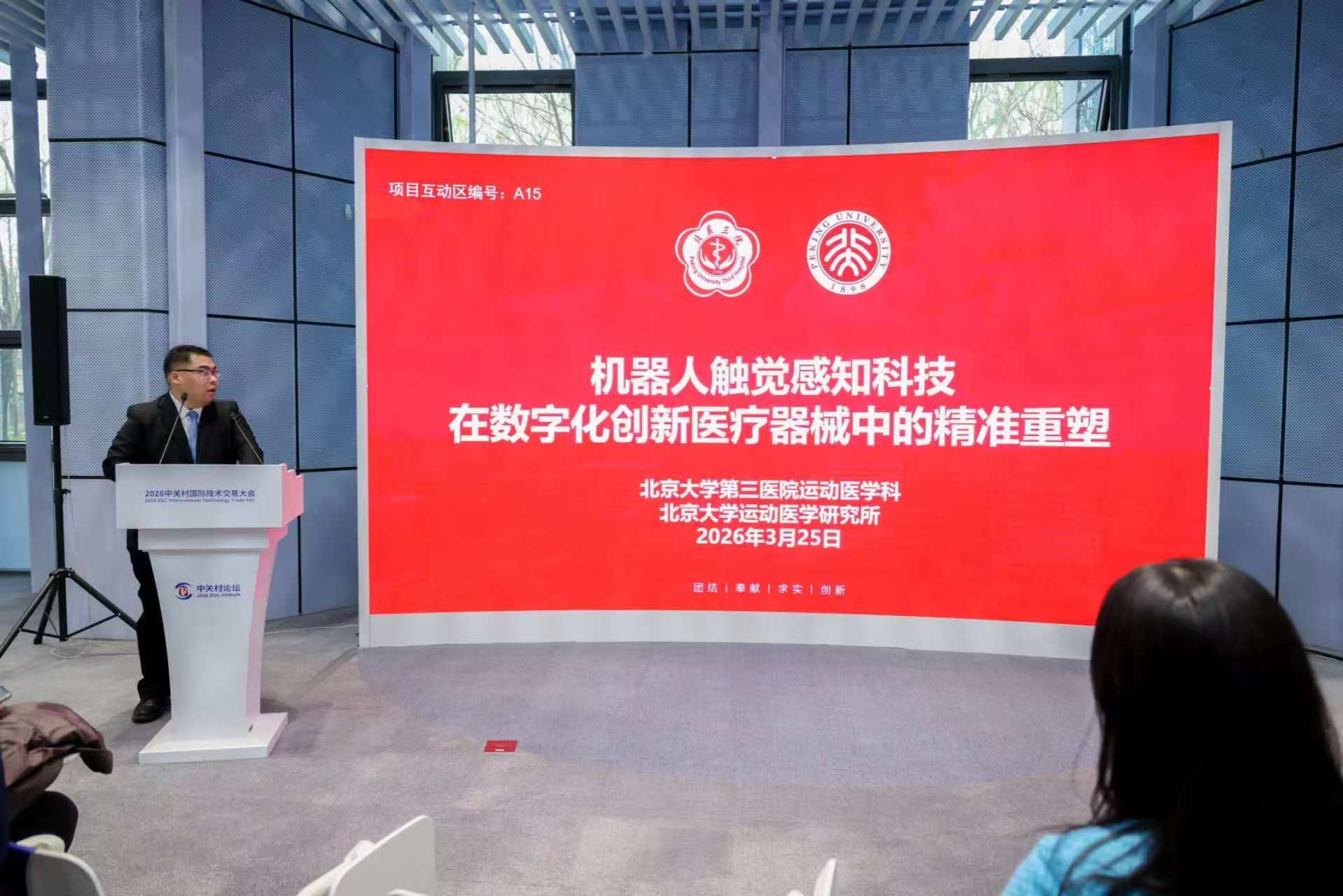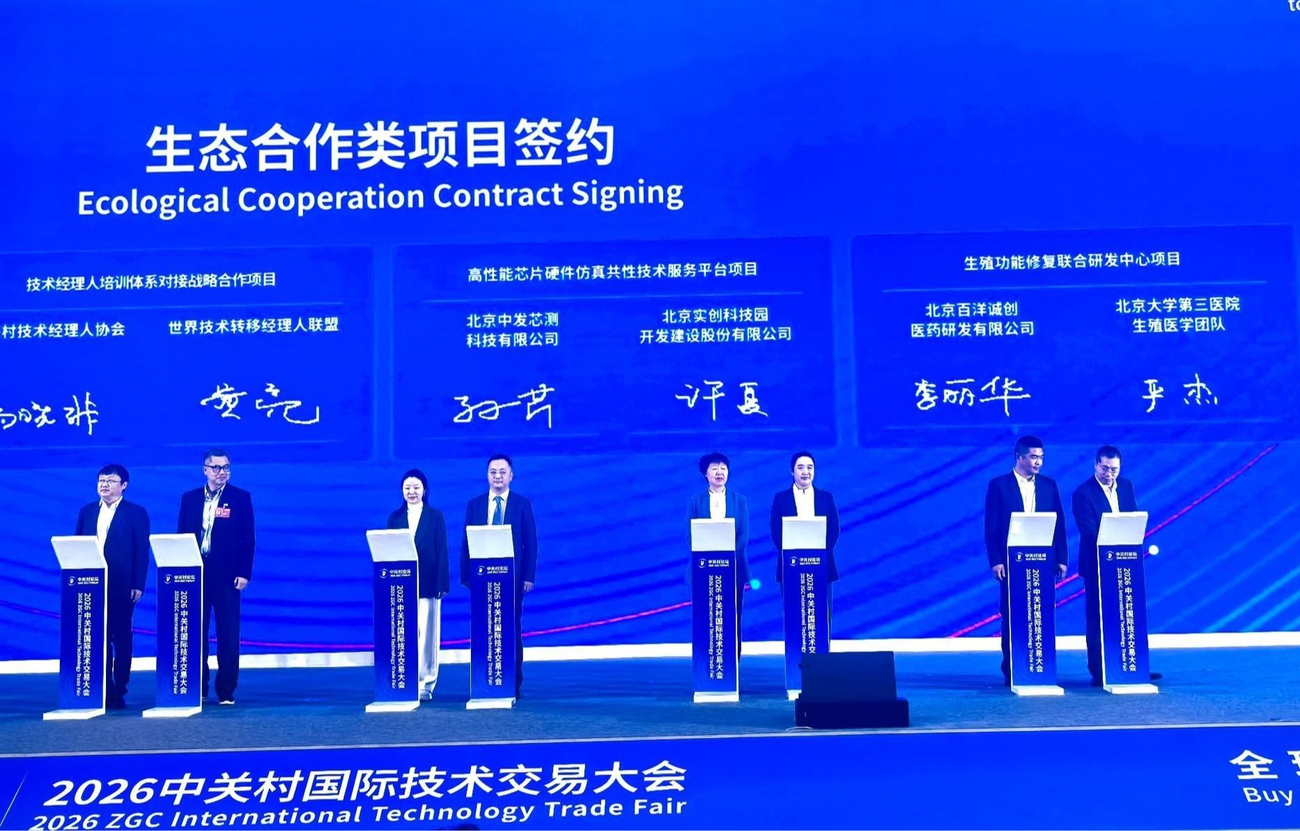 3月25日下午,在2026中关村国际技术交易大会开幕式上,18个项目现场签约,北医三院两个项目入选。成果转化类项目签约现场骨科李危石团队“脊柱椎板减压手术机器人”作为“成果转化类”6个重大项目之一进行签约。生态合作类签约现场生殖医学科严杰团队与百洋医药集团共建的“北医三院-百洋诚创生殖功能修复联合研发中心”作为“生态合作类”6个重大项目之一进行签约。此次签约将加速科研成果转化,推动创新链、产业链、人才链深度融合,加快培育发展新质生产力。