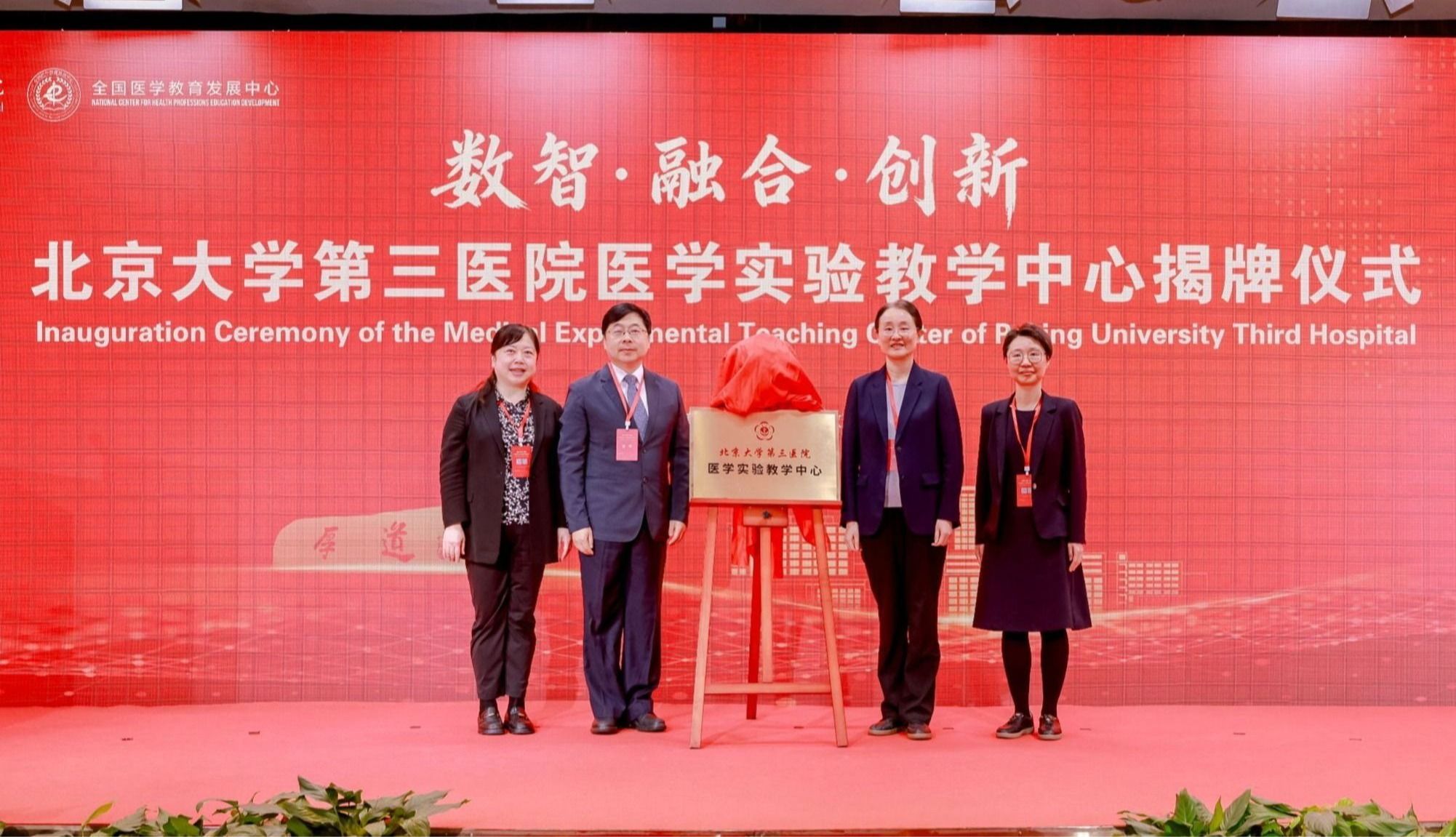 在分论坛上,北京大学第三医院医学实验教学中心揭牌仪式举行,北京大学研究生院副院长徐明,沈宁、韩江莉,北医三院中心实验室黄琛等上台揭牌,标志着北医三院在跨学科实践教学平台建设上迈出新步伐。