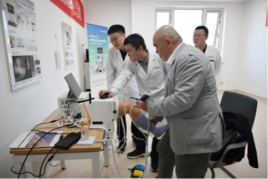 4月20日,代表团前往北医三院崇礼院区参观交流。崇礼院区作为国家区域医疗中心(运动创伤)建设单位,是北医三院推动优质医疗资源扩容下沉的重要窗口。代表团实地参观了冰雪运动医学中心、康复治疗区,现场观摩冲击波治疗、步态分析等临床实操演示,详细了解冬奥医疗保障经典案例及骨科精准诊疗技术的应用。随后,运动医学科团队为两国专家展示“数康师”设备。代表团专家对崇礼院区完善的学科布局与先进的康复设备给予高度评价,并就骨科创伤、脊柱外科、关节外科等领域的临床技术难点展开深入交流。
