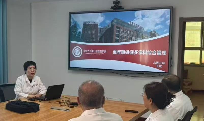 义诊团队由妇科王威、内分泌科李琳、骨科范东伟、中医科祝雨田等多科室专家组成。义诊活动前,延庆区妇幼保健院院长张立峰及相关科室负责人与北医三院专家团队,就更年期专科门诊建设、多学科联合开展更年期健康管理等进行了深入交流。王威主任医师分享了北医三院更年期保健多学科综合管理经验。