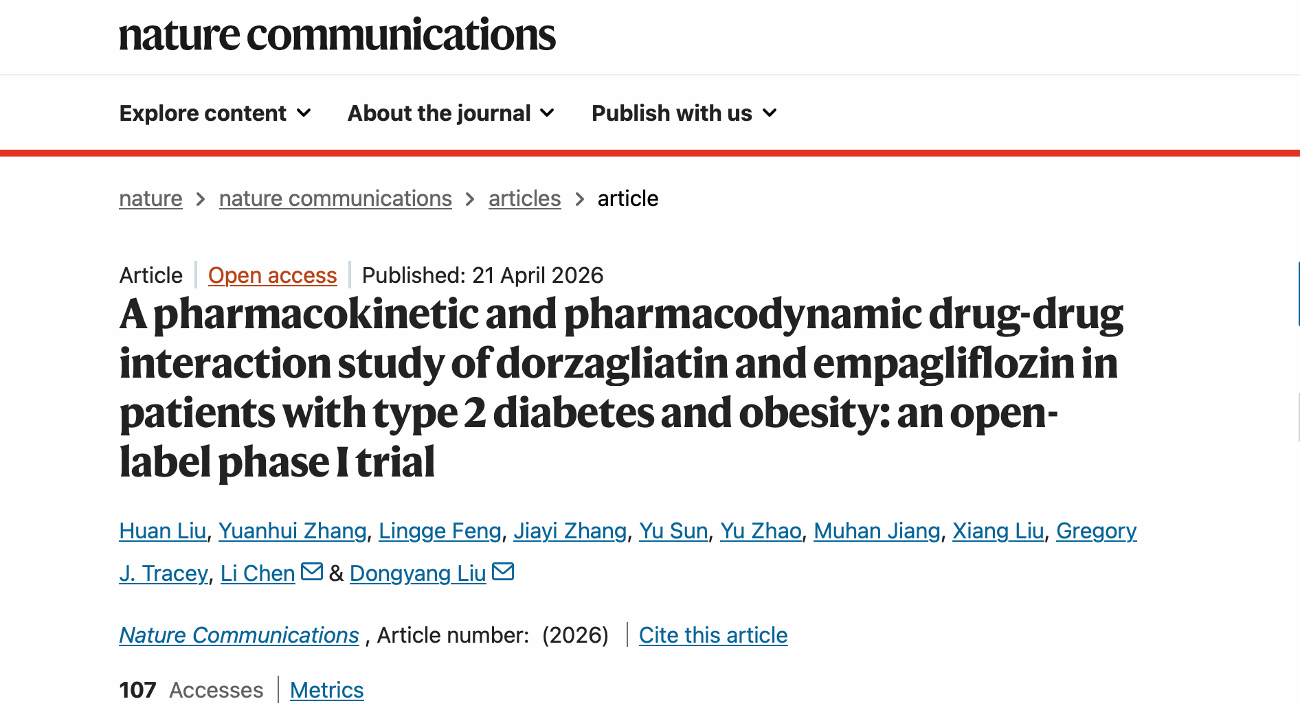 2026年4月21日,北京大学第三医院药物临床试验机构刘东阳研究员团队和合作者陈力博士团队合作,在Nature Communications(《自然通讯》)上发表题为“A pharmacokinetic and pharmacodynamic drug-drug interaction study of dorzagliatin and empagliflozin in patients with type 2 diabetes and obesity: an open-label phase I trial”(一项多格列艾汀与恩格列净在肥胖二型糖尿病患者中的药代动力学、药效动力学药物相互作用研究:一项开放性I期临床试验)的研究论文,使用描述性统计和创新药效学数学模型方法系统评价了多格列艾汀与恩格列净合用后的安全性、药代动力学、药效动力学特征,为多格列艾汀与恩格列净在临床中的联合应用提供了坚实的理论基础。