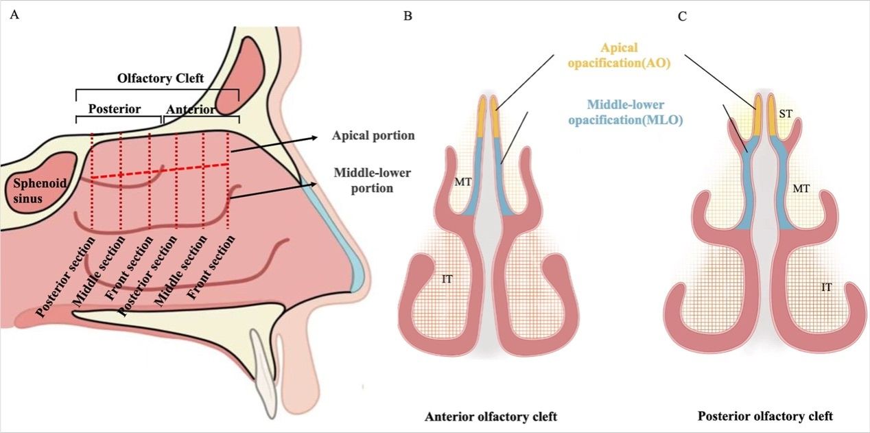 我国慢性鼻窦炎(chronic rhinosinusitis,CRS)患病率高达8%,其中嗜酸性粒细胞性慢性鼻窦炎(eosinophilic chronic rhinosinusitis, eCRS)为临床上难治性上气道疾病,约占50% CRS患者,5年鼻内镜术后复发率高达80%。中央区变应性疾病(CCAD)被认为是eCRS的早期阶段,以2型炎症为特点,嗅觉障碍作为CCAD患者的核心症状,出现最早且最为突出。嗅裂作为气味分子传导的核心通道,其阻塞是导致CCAD嗅觉障碍发病的关键致病因素。然而,现有影像学评分系统对嗅裂各亚区浑浊的评估较为粗糙,难以揭示CCAD特有的阻塞模式及其与嗅觉功能的量化关系,亟需开发一种能够系统评估嗅裂多截面浑浊模式、关联炎症状态以及嗅觉障碍的影像学工具。