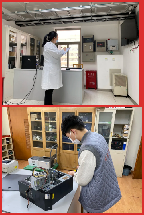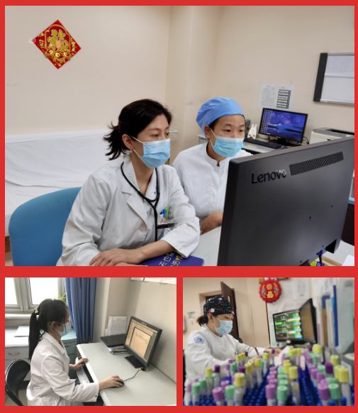 北方院区医护24小时病房楼值岗,保护患者安全。检验科工作人员正在为门诊患者样本检测,收费处窗口除夕不打烊,保证实时结算。