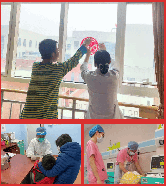 儿科病房里,小患者和我们一起贴福字。儿科发热门诊,孙晋波医生正在给小患者问诊。