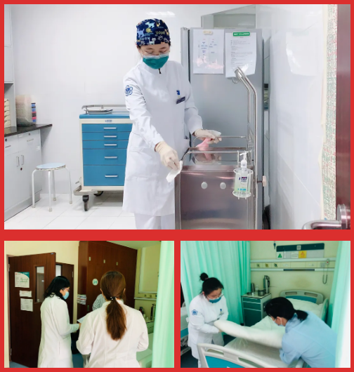 总务处工程师正在巡视和切换液氧设备,保障节日供电安全。总务处探视管理人员正在仔细核对信息。保洁人员一丝不苟地在医院各个角落进行消毒。