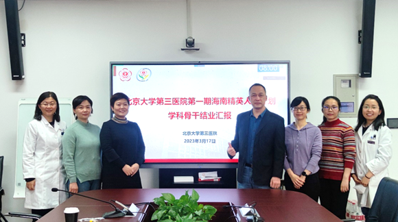 2023年3月17日,北京大学第三医院首批海南省精英人才计划学员完成为期一年的学科骨干培训,在北京大学第三医院教育教学中心B618会议室进行结业汇报。老年内科副主任刘慧琳和妇产科副主任杨蕊作为导师代表和科室教学专家参加会议;教育处副处长张祺和相关管理老师一同参会,2023年北京市基层骨干及黔医计划学员通过线上形式观摩。