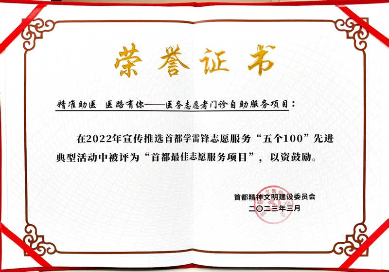 日前,首都精神文明建设委员会组织开展2022年宣传推选首都学雷锋志愿服务“五个100” 先进典型活动。北京大学第三医院开展并申报的“精准助医 医路有你——医务志愿者门诊自助服务项目”成功入选,被评为“首都最佳志愿服务项目”。