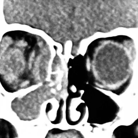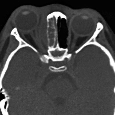 耳鼻喉科闫燕主任高度重视患儿病情,组织全科进行了病例讨论。考虑到患儿是3岁女童,眼部切口进行眶内脓肿引流对于患儿将来的面容存在影响,且术后眼部换药患儿难以配合,CT所见患儿炎症集中在眼眶内壁周围,可以尝试经鼻进行手术。马芙蓉教授阅片后发现,患儿的眶内下角存在一个非常小的骨质不连续区域,可能是炎症从鼻窦向眼眶感染的通道,也是经鼻进行引流手术的关键突破口。