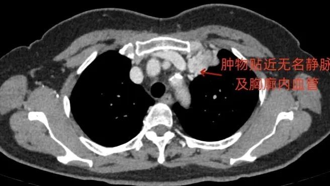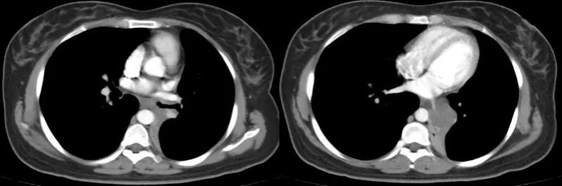 无独有偶,近期胸外科还联合心脏外科完成了另外一例复杂的胸腔肿瘤手术。付女士是一位70岁的老年女性,2024年3月因为反复咳嗽就诊,胸部CT检查发现,心脏的侧前方有一个巨大肿瘤。肿瘤与一些无名静脉、胸廓内动静脉等关键血管以及肺门的关系非常密切。