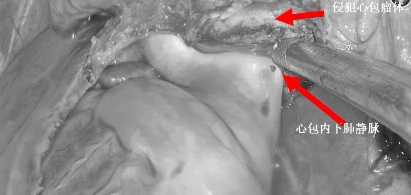 术中,胸外科团队先尝试腔镜下探查。正如术前判断,由于肿瘤播散侵犯了心脏,完全包绕下肺门及关键血管——左肺下叶静脉,前后肺门都难以游离出下肺静脉。强光亮冷静思索后决定:可以从心包内尝试。强光亮在安全距离打开心包,探查到关键血管——上下肺静脉。然而,手术团队又面临新的问题:心包内下肺静脉也被肿瘤包绕,难以游离出足够的长度。