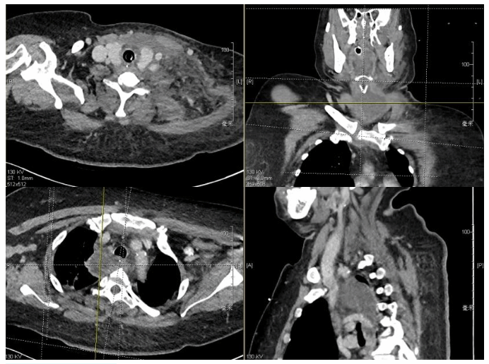 耳鼻喉科急诊为李女士完善了相关化验及检查后,诊断为颈深部脓肿,而且颈部的感染顺着气管周围间隙直达上纵隔,形成了下行性纵隔脓肿。