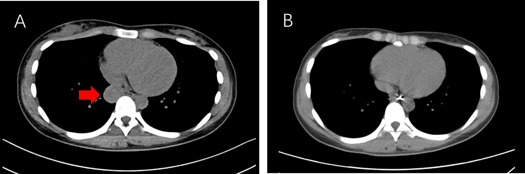 A.术前胸部CT见后纵膈食管旁肿物(红色箭头) B.术后复查未见肿物