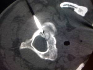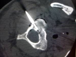 1.3 CT扫描定位穿刺层面,常规消毒铺巾局麻后,CT引导下逐渐穿入骨穿针,到达病灶处,将射频电极沿骨穿针道穿入肿瘤组织,CT扫描位置满意后开始射频治疗 1.4单次射频结束后,退出射频针,退出过程中消融针道,防止播散,如需多次射频,则调整针道或另选穿刺路径进行穿刺,均在CT引导下进行