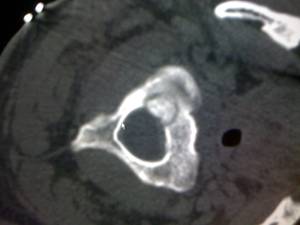 术前:VAS评分10分,CT表现齿突基底右侧占位,成骨性病变,没有明确的瘤巢。