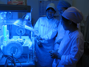 璐颖与当年的主管大夫、主管护士在一起,观看暖箱里如自己当年一样大的早产儿