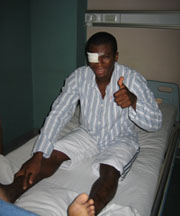 经过精心手术治疗,足球赛场上被踢伤右眼的外籍球员班古拉的右眼有希望保住,并有视力恢复的可能。这是班古拉术后第三天,眼科中心马志中教授查房说的。