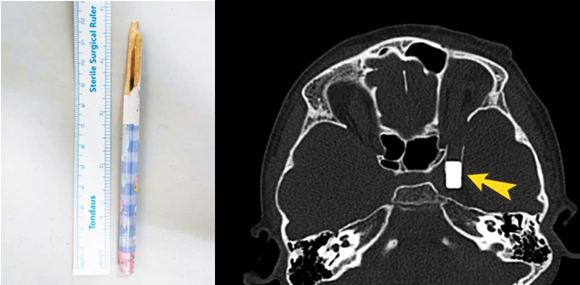 左图:患者自行拔出的铅笔残端;右图:术前评估异物位置