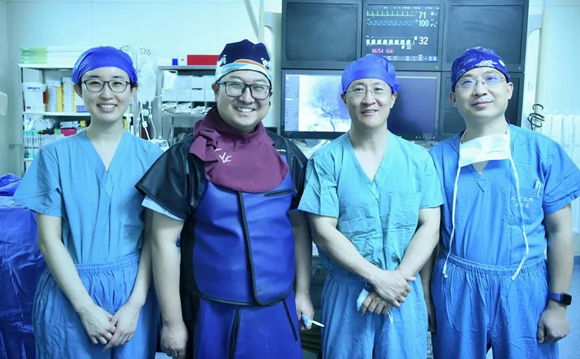 手术团队,左起:眼科郭雨欣、介入血管外科韩金涛、眼科王毅、麻醉科刘伟平