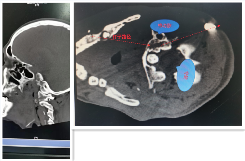 因患者自带的头面部CT胶片未能明确钉子的确切位置,为明确钉子的具体位置和周围重要结构的关系,骨科医师立即安排患者进行寰枢椎CT检查。