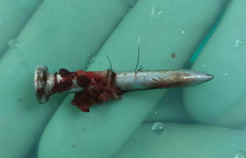 凌晨5时,在麻醉科和手术室团队的配合下,周华副主任医师主刀,从患者颈后入路,沿钉子周围切口扩创,小心探查并游离钉子周围组织,仔细分离粘连,到达钉子尾端,将钉子完整取出。
