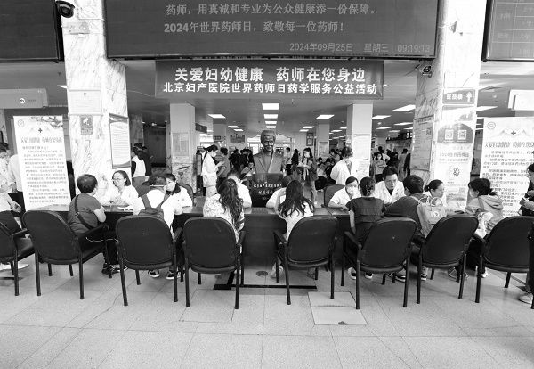 在这一天,北京市很多医疗机构在院内举办活动,庆祝药师的节日。在首都医科大学附属北京妇产医院的门诊大厅,药师团队正为闻讯赶来的患者答疑解惑。